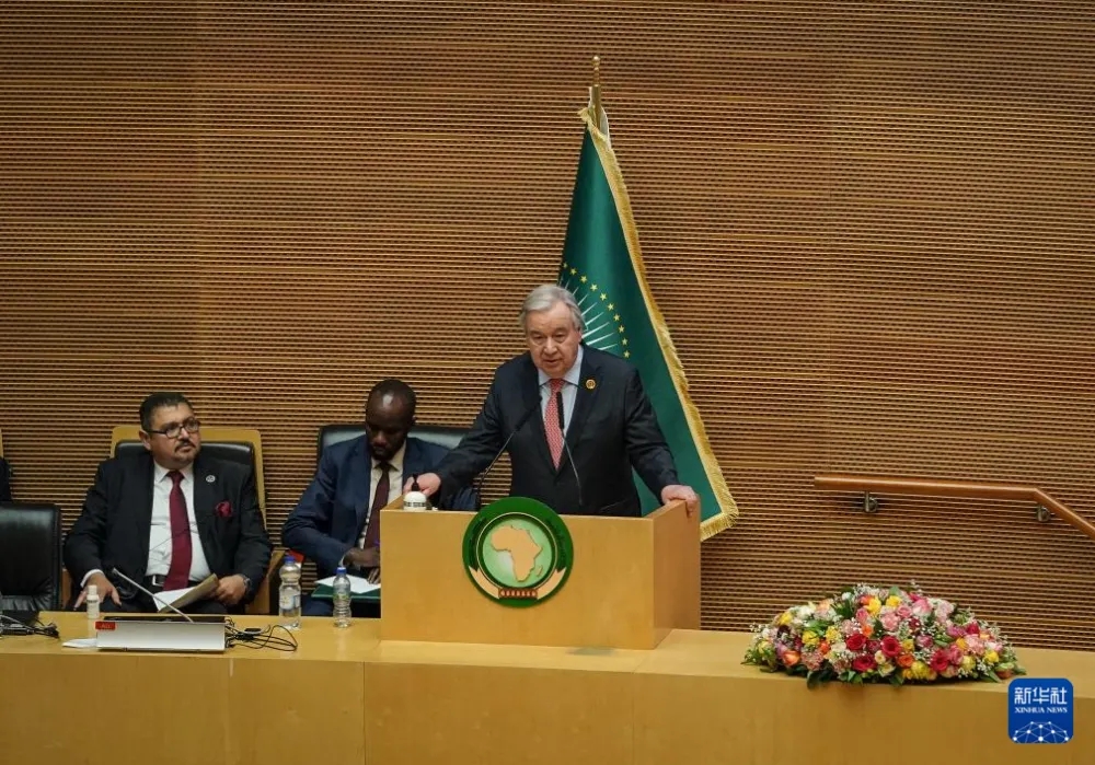 2月15日(ri),在(zai)埃塞俄比亞首(shou)都(dou)亞的(de)斯亞貝巴(ba),聯(lian)合國秘書長古(gu)特雷(lei)斯在(zai)開幕式(shi)上發言。