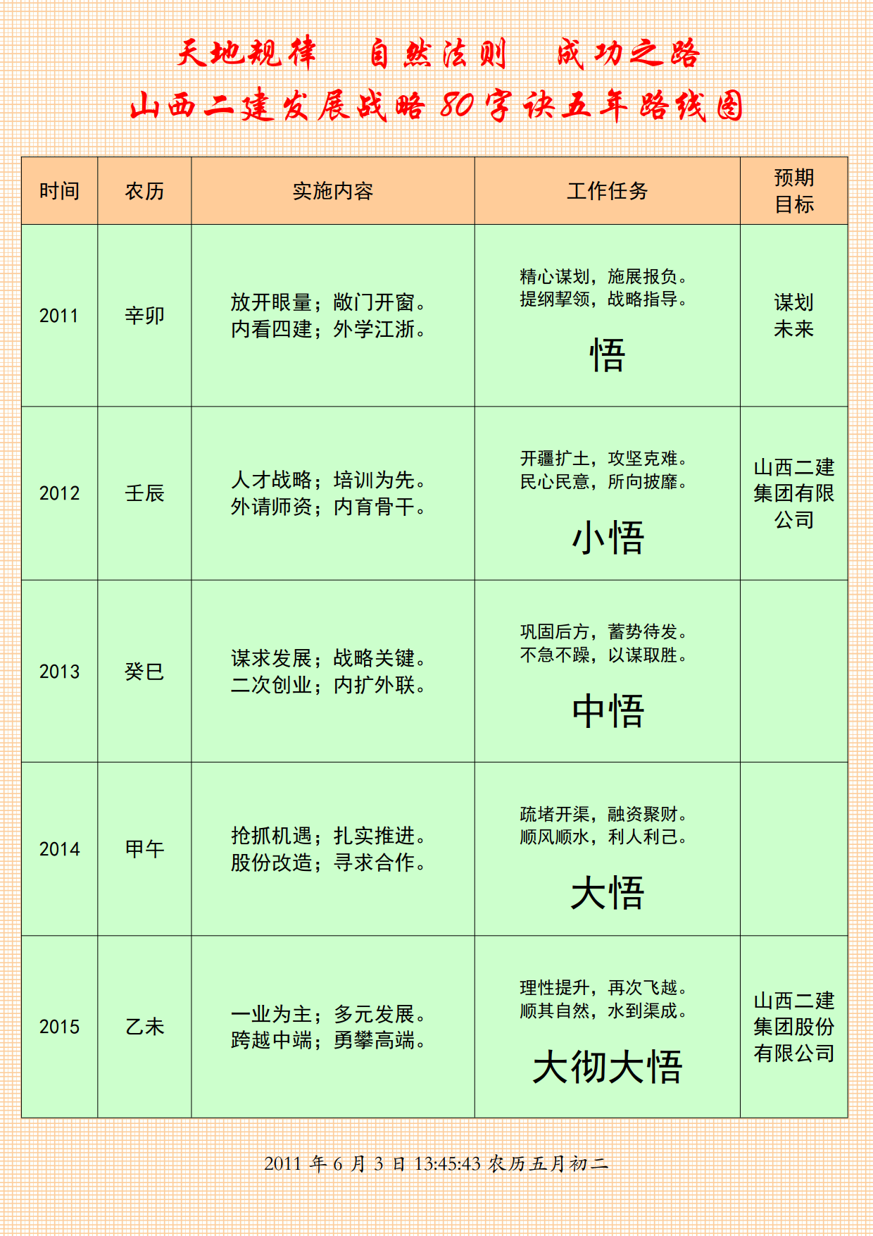 2011年在省建協的時候,某一天我的小靈通突然連續響了起來,拿出來看,顯示13個1。起初,我以為是觸碰造成的,并不在意。但是,無論怎么操作,甚至取出電池,一直消除不掉。第二天下午,與二建總經理會晤,說起此事,專門讓他看。他說,這倒奇怪了,沒有遇到過這樣的事情。再按退出鍵,13個1不見了。那么,十三個一要告訴我什么呢,是一三年需要幫助比我小十三歲的人,需要三個十年成就他的事業。第一個十年,在磕磕碰碰中走過來了;現在第二個十年開始了,這個十年是最關鍵的十年;第三個十年才能達到一流企業的戰略目標。