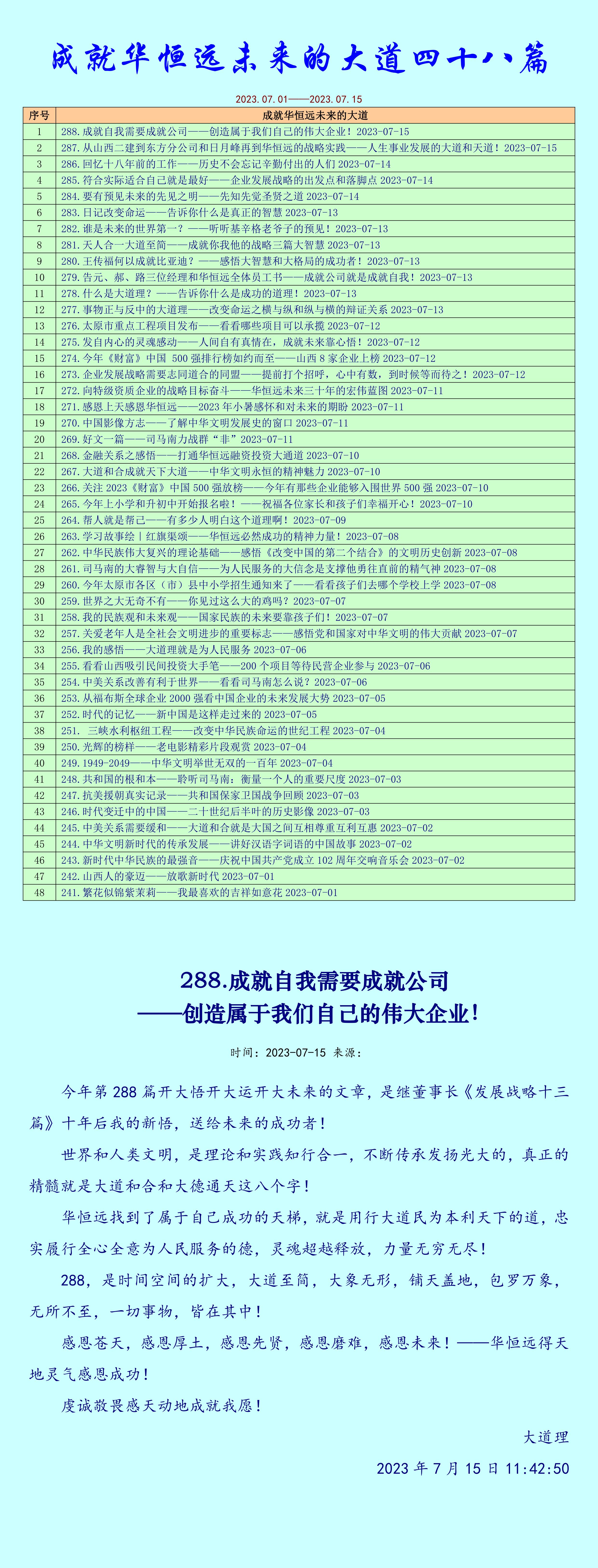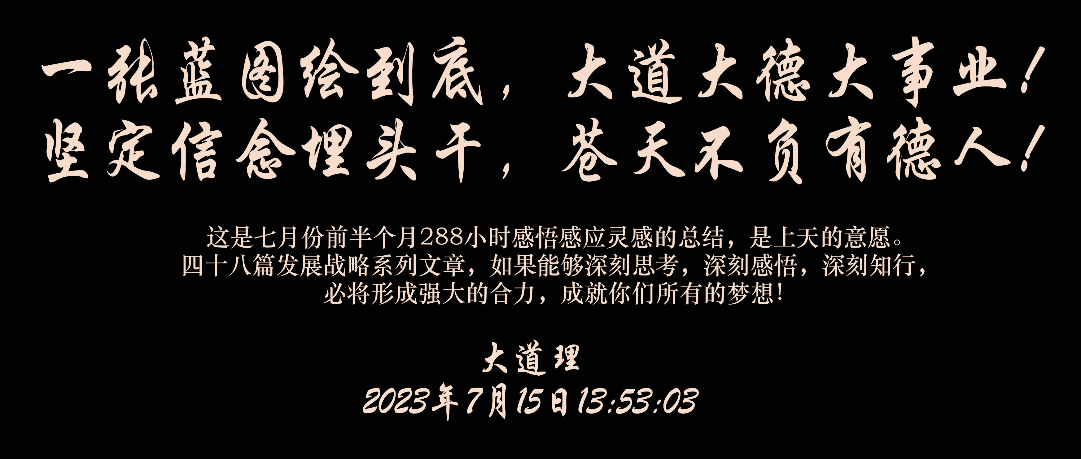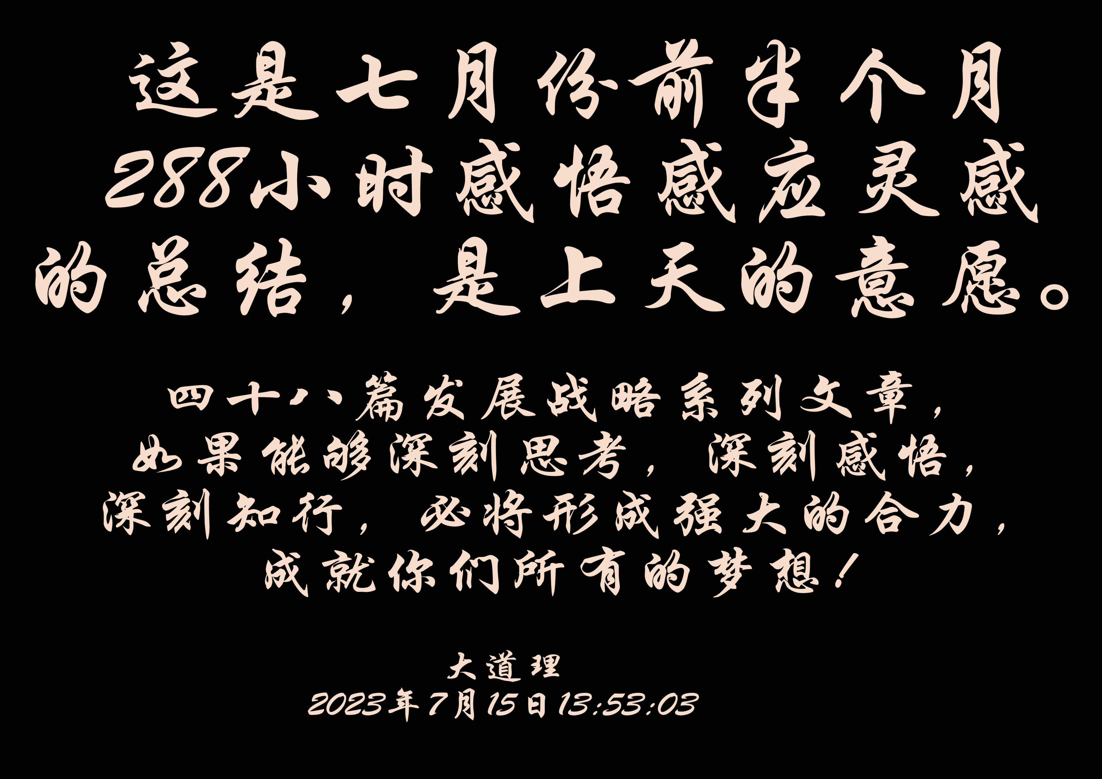 這是(shi)(shi)七月(yue)份前半個月(yue)288小時感悟感應靈(ling)感的(de)總結(jie),是(shi)(shi)上(shang)天的(de)意愿。四(si)十八篇發展戰(zhan)略系列文章,如果能(neng)夠(gou)深刻(ke)思考(kao),深刻(ke)感悟,深刻(ke)知(zhi)行(xing),必(bi)將形成(cheng)強大的(de)合力,成(cheng)就你們所有的(de)夢想!