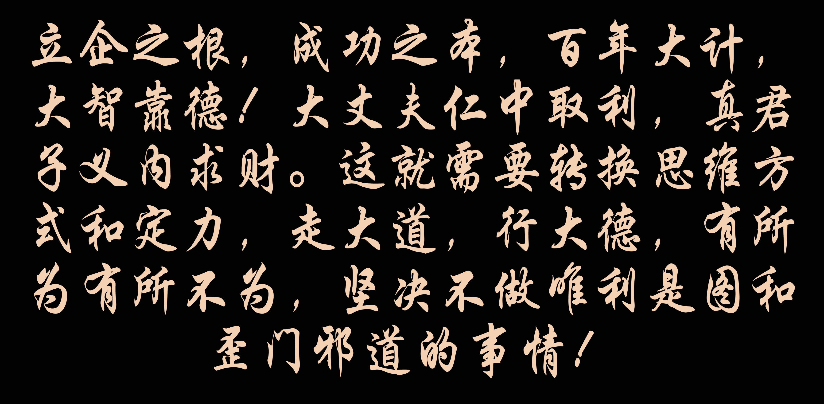 立企之(zhi)根,成功之(zhi)本,百年(nian)大計,大智靠德!大丈夫仁中取(qu)利,真君子義內求財。這就需要轉換思維方式和定力,走大道,行大德,有所為有所不為,堅決不做唯利是圖和歪門邪道的事情,把自己的前途和命運牢牢把握在自己手中,經得起耐的住各種各樣的誘惑和考驗,誠信做人,仁義做事,為子孫后代做好成就百年企業的榜樣!