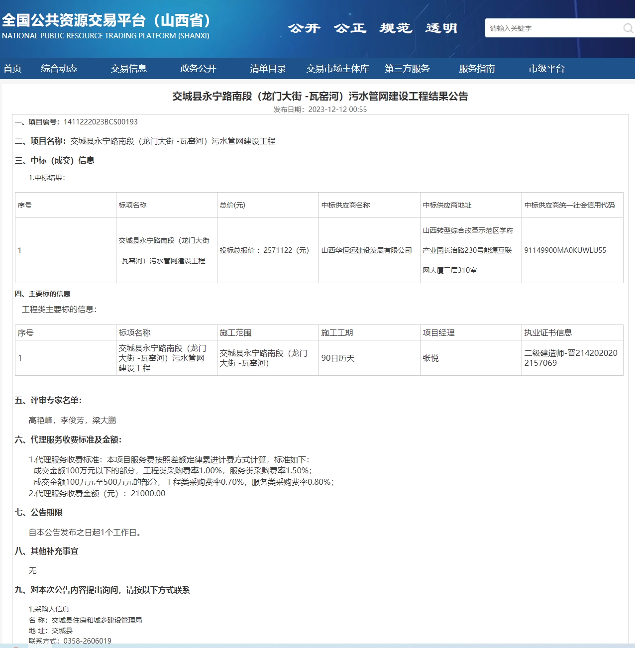 交城縣永寧路南段(龍門大街 -瓦窯河)污水管網建設工程