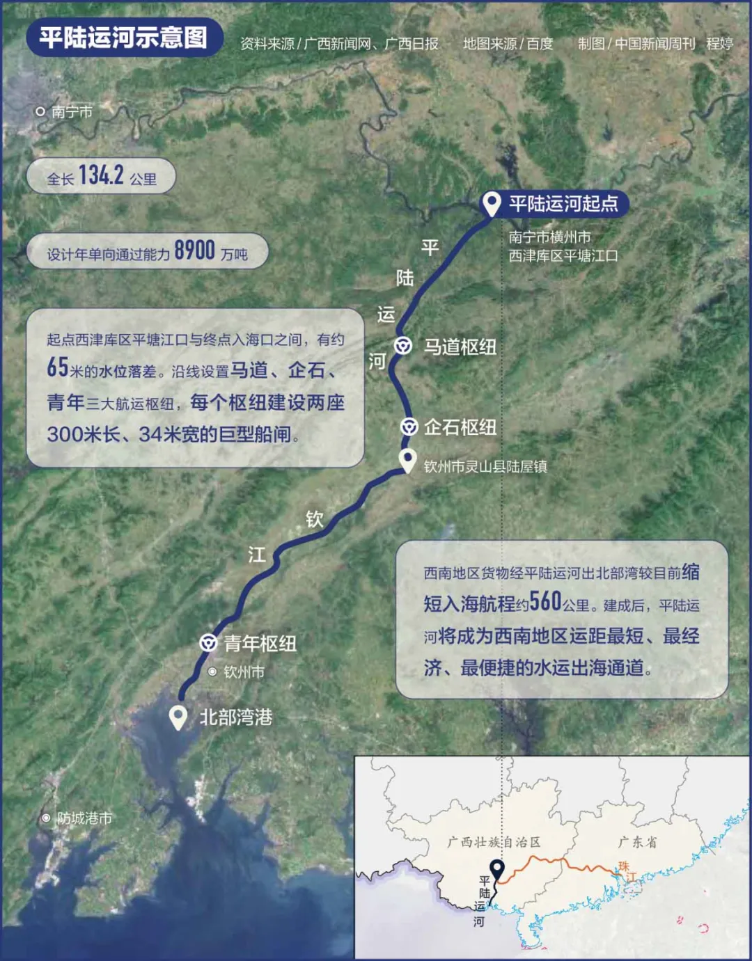 這條全長134.2公里的運河(he),始于(yu)南寧橫州市西(xi)津庫(ku)區(qu)(qu)平(ping)塘江口,經欽州靈山縣陸(lu)屋鎮沿(yan)欽江進入北部灣(wan),項目(mu)總投(tou)資約(yue)727億元(yuan)。建成(cheng)后,廣西(xi)乃至(zhi)西(xi)南地區(qu)(qu)的貨物經平(ping)陸(lu)運河(he)出海,航程可節省約(yue)560公里。