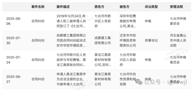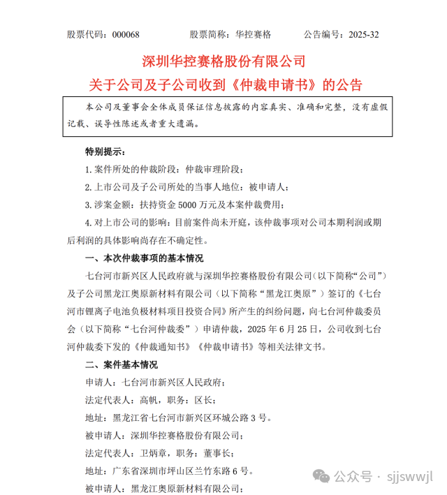 6月(yue)25日,華(hua)控(kong)賽格及(ji)子公司黑龍(long)江奧原(yuan)新材料(liao)有限公司收到(dao)七臺河仲(zhong)裁(cai)委員會(hui)的(de)《仲(zhong)裁(cai)通(tong)知書》及(ji)相關法律文書,6月(yue)27日首次披露仲(zhong)裁(cai)情況,正式宣告案件進入仲(zhong)裁(cai)程序。