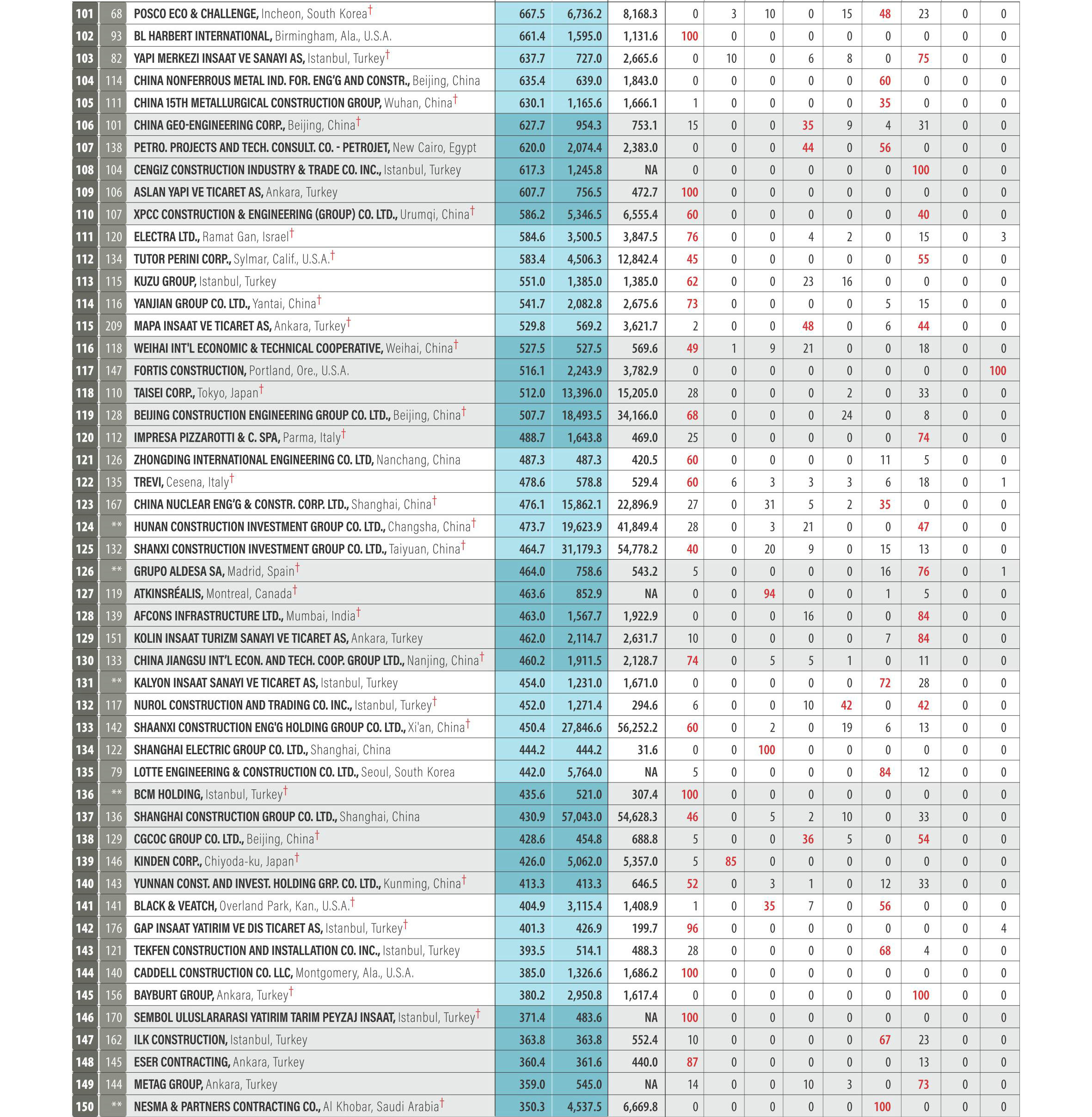在ENR同期發布的“最大250家全球承包商”榜單中(以國內與國際營業額合計排序),共7家中國企業進入前10強,與上年度持平,其中中國建筑、中國中鐵、中國鐵建、中國交建包攬前4位,中國電建排名第6位、中冶科工排名第7位、上海建工排名第8位。此外,中國能建、北京城建、山西建投、中國化學工程、陜西建工、湖南建投、北京建工、綠地大基建、中國核建、安徽建工、特變電工、中油工程、山東高速、浙江建投、四川路橋、東方電氣、上海城建等企業進入榜單前50強,體現了中國企業在全球基建行業的重要地位。