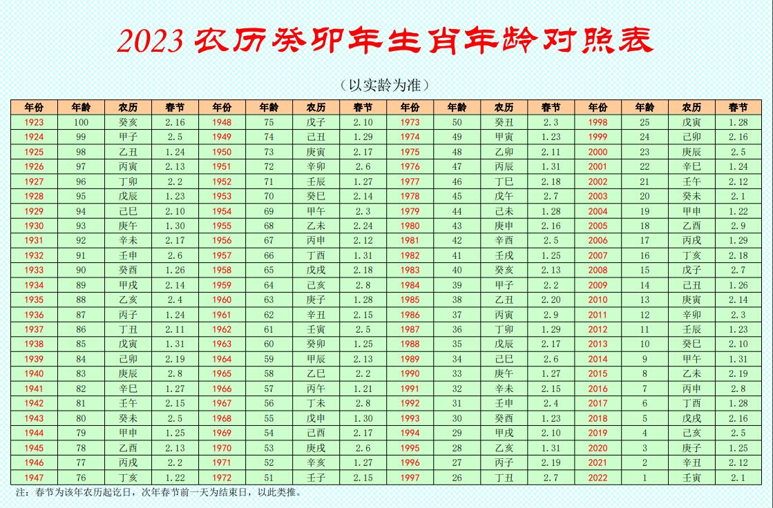 2023農(nong)歷癸卯年生肖(xiao)年齡對(dui)照表(biao)