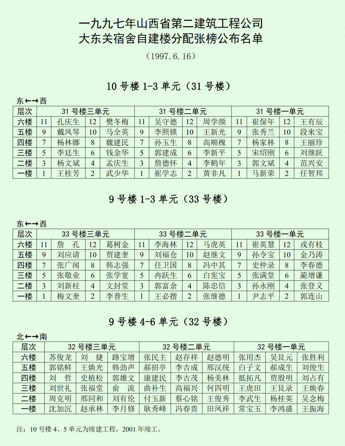 回到主題,下面是省建二公司上世紀末,最后一次福利分房,當時每平米價格是408元。找到山西二建、山西四建的資料后,捎帶看到這份分房榜。一下子又把我帶回1997年,那次張榜公布最后定案的名單。那時候,這可是公司所有職工盼望已久,翹首以待的結果,真是有人歡喜有人愁啊!看到了嗎,我分到的房子,可以說是上上等,無論從位置、層次、光照、朝向看,都無話可說,那是上上下下幾千人都日思夜想的愿望啊!之前,我并沒有因為個人利益找過任何公司領導,倒是主管分房的領導專門到科里征求我的意見,看上哪套要哪套,其他人不征求個人意見,只對科長你例外!我攜了妻子、兒子去自建樓實地考察。六層磚混結構樓,按說三層為佳,可是由于樓間距問題,四層光照更好一些,這對妻子的關節炎有好處。一家人充分協商,最后確定了中間單元四層左戶。回公司,也就打個電話告知分房領導。現在回想起來,當時確實欠妥,看把你了不得的,你的架子也忒大了吧!連一句感謝的話都舍不得說,別人把分房領導的門都踏破了,使出渾身解數,哭的、鬧的、軟硬兼施,最后還是不能如愿,甚至記恨一輩子!