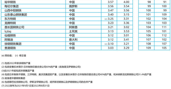 2022年主要鋼鐵公司產量排名
