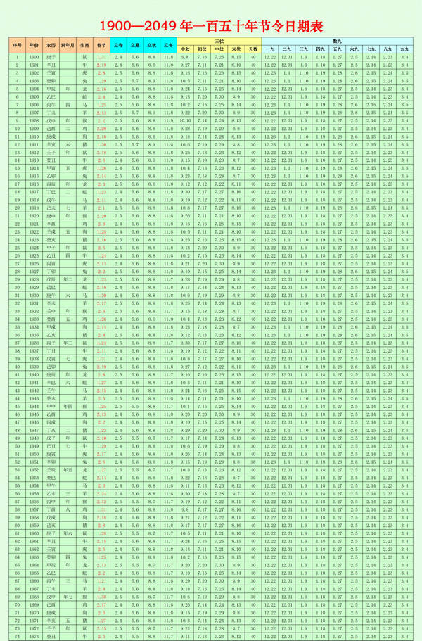 1900-2049二十四節氣及公歷農歷佛歷和三伏數九中秋春節日期表