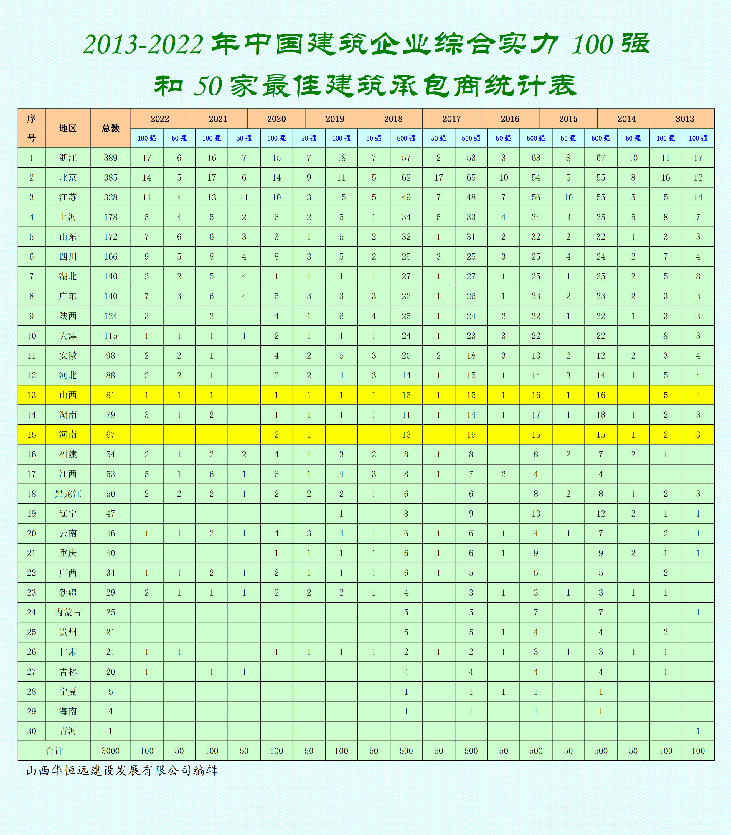 2013-2022年中國建筑企(qi)業綜合實力100強和50家最佳建筑承(cheng)包商排行榜