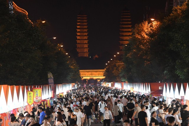 2024年7月(yue)16日,山(shan)(shan)西太原,雙(shuang)塔(ta)寺(si)前人山(shan)(shan)人海(hai)。豐富(fu)多彩的夜間主題活動(dong),滿足人們舒適納涼的需求,進一步催熱(re)“夏日夜經(jing)濟”。視覺中國 資料(liao)圖(tu)