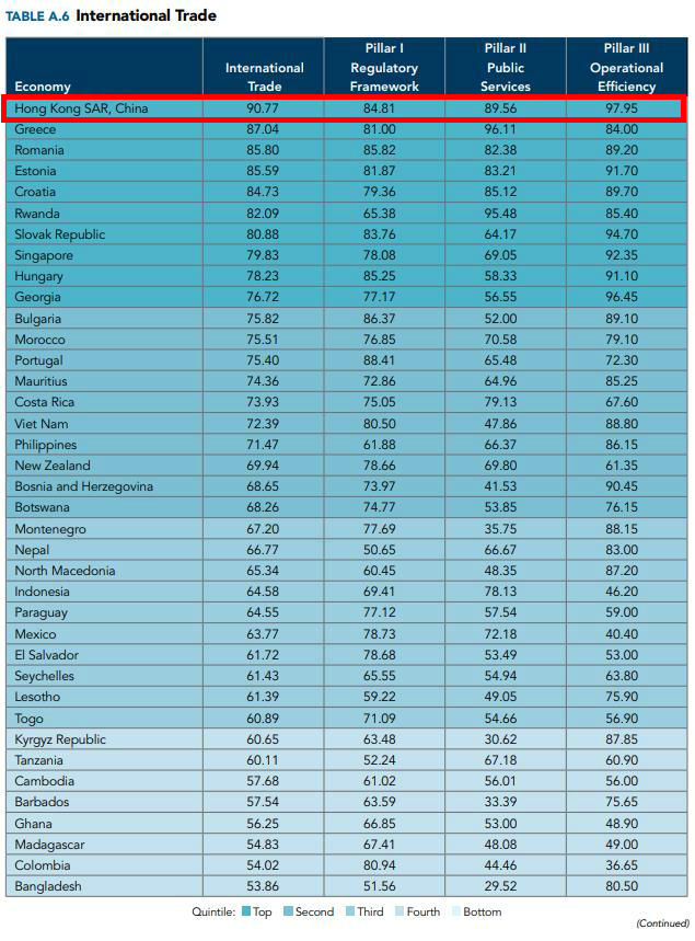 報告(gao)屬試行性質,以(yi)十項指標(biao)及(ji)三(san)(san)個(ge)維度(du)比較各個(ge)經濟體在(zai)營商(shang)環境(jing)方(fang)面(mian)的整體表現。在(zai)十項指標(biao)當中,香(xiang)港獲最高分(fen)數的三(san)(san)項分(fen)別是“國(guo)際貿易”(90.77分(fen))、“市場準入”(85.49分(fen))及(ji)“市政公用基礎設施服務”(77.71分(fen))。在(zai)三(san)(san)個(ge)維度(du)當中,香(xiang)港在(zai)“辦事(shi)效率”維度(du)的總體得分(fen)是78.52,排名第五。