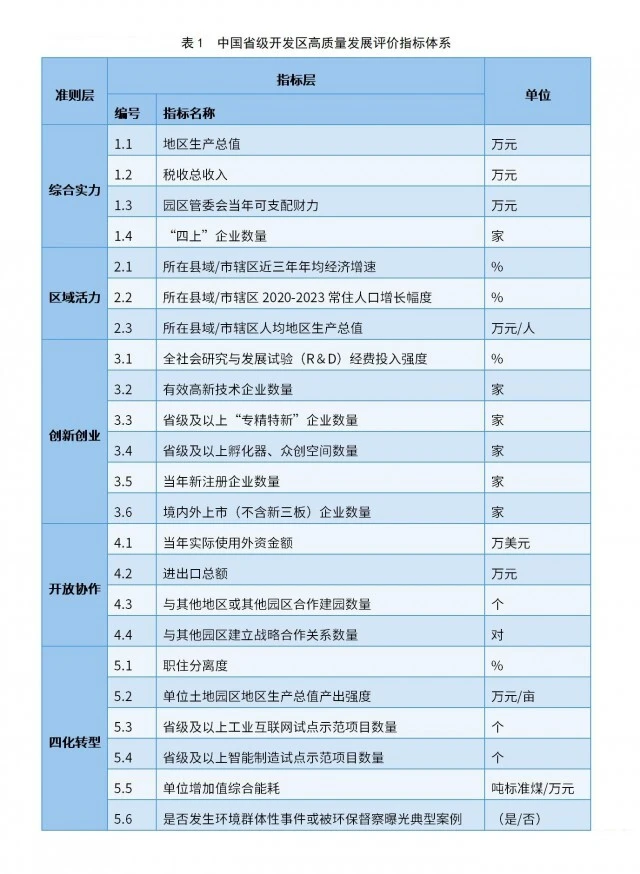 為客觀評(ping)價省(sheng)(sheng)級(ji)(ji)開(kai)發(fa)區(qu)發(fa)展(zhan)狀(zhuang)況(kuang),引領省(sheng)(sheng)級(ji)(ji)開(kai)發(fa)區(qu)實現更高(gao)(gao)(gao)質量發(fa)展(zhan),樹立省(sheng)(sheng)級(ji)(ji)開(kai)發(fa)區(qu)高(gao)(gao)(gao)質量發(fa)展(zhan)典型(xing),推動(dong)高(gao)(gao)(gao)水(shui)平(ping)省(sheng)(sheng)級(ji)(ji)開(kai)發(fa)區(qu)“升格”發(fa)展(zhan),引導(dao)高(gao)(gao)(gao)端生產要素合(he)(he)理流動(dong)和(he)高(gao)(gao)(gao)效配置,報告按照目(mu)標(biao)導(dao)向(xiang)、問題導(dao)向(xiang)和(he)結(jie)果導(dao)向(xiang)相(xiang)統一的原(yuan)則(ze),結(jie)合(he)(he)指(zhi)標(biao)設置科學性(xing)和(he)數據可(ke)得(de)性(xing),構建了省(sheng)(sheng)級(ji)(ji)開(kai)發(fa)區(qu)高(gao)(gao)(gao)質量發(fa)展(zhan)評(ping)價指(zhi)標(biao)體系(表1)。