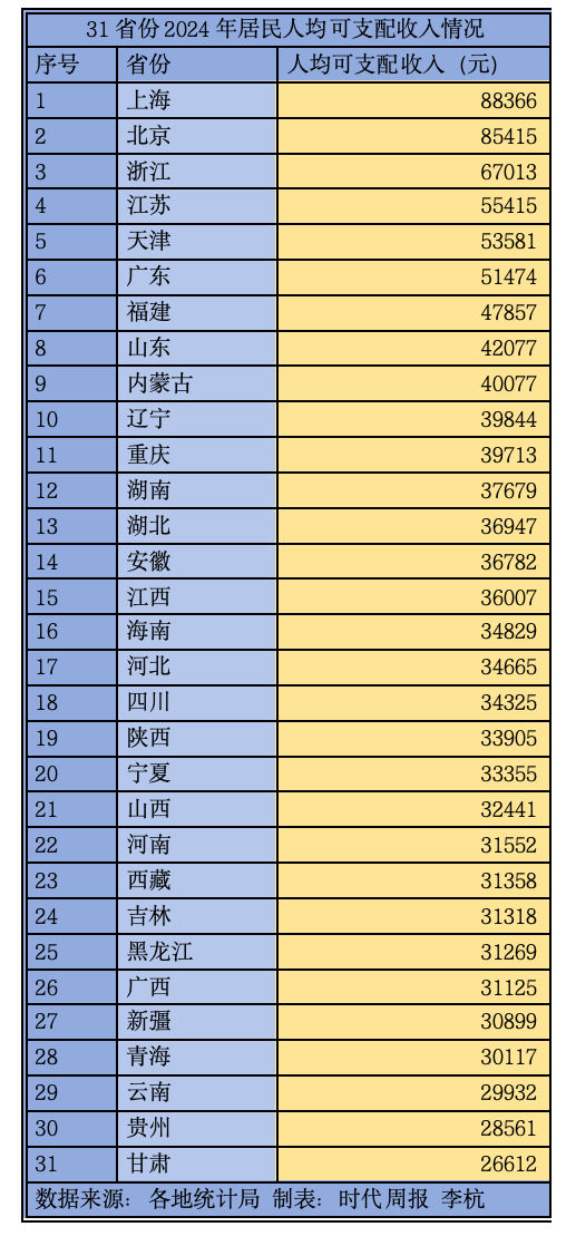 同時,各省份數(shu)據(ju)也已經全(quan)部出爐。數(shu)據(ju)顯示(shi),2024年共有8個省份的居民人均可支(zhi)配收入超過了全(quan)國(guo)平均水平,分別是(shi)上海、北京、浙江(jiang)(jiang)、江(jiang)(jiang)蘇、天津(jin)、廣東、福建和山(shan)東。