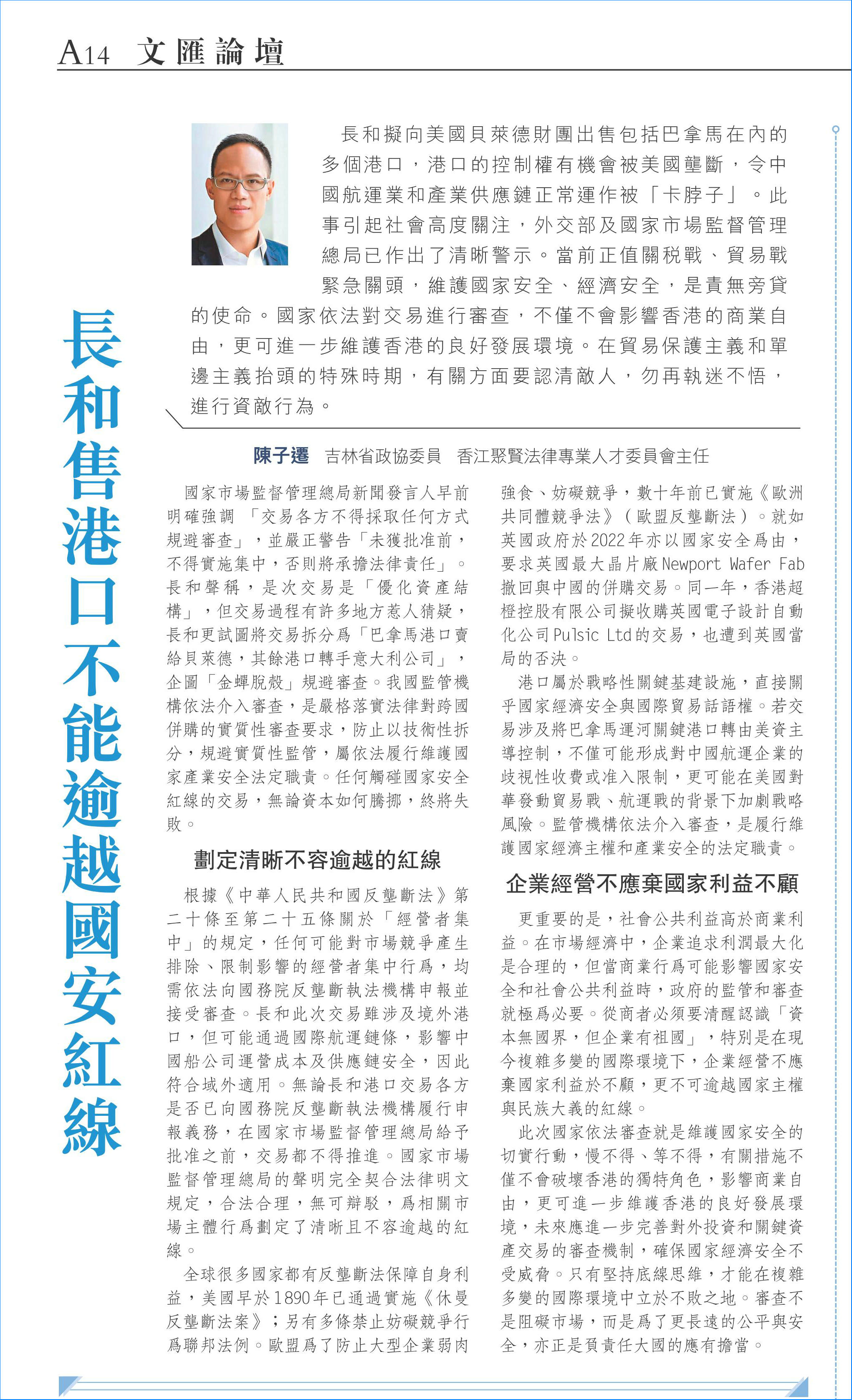 長和擬向美國貝萊德財團出售包括巴拿馬在內的多個港口,港口的控制權有機會被美國壟斷,令中國航運業和產業供應鏈正常運作被「卡脖子」。此事引起社會高度關注,外交部及國家市場監督管理總局已作出了清晰警示。當前正值關稅戰、貿易戰緊急關頭,維護國家安全、經濟安全,是責無旁貸的使命。國家依法對交易進行審查,不僅不會影響香港的商業自由,更可進一步維護香港的良好發展環境。在貿易保護主義和單邊主義抬頭的特殊時期,有關方面要認清敵人,勿再執迷不悟,進行資敵行為。