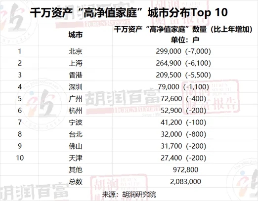 北京仍然是(shi)擁(yong)有最多億元(yuan)資產“超高凈值家庭”的(de)地區,比(bi)上年減少1,000戶至(zhi)19,400戶,減少4.9%,其中(zhong)擁(yong)有億元可投資資產的“超高凈值家庭”數(shu)量有11,400戶;廣東第二,億元資(zi)產“超高(gao)(gao)凈(jing)值家(jia)庭(ting)”比上(shang)年(nian)減少(shao)840戶(hu)至17,300戶(hu),減少(shao)4.6%,其中擁有(you)億元可投資(zi)資(zi)產的“超高(gao)(gao)凈(jing)值家(jia)庭(ting)”數量有(you)10,500戶(hu);上海第三,億元資(zi)產(chan)“超高凈值家庭(ting)”比上年減(jian)少770戶(hu)(hu)至16,830戶(hu)(hu),減(jian)少4.4%,其中(zhong)擁(yong)有億元可投資(zi)資(zi)產(chan)的(de)“超高凈值家庭(ting)”數(shu)量有10,210戶(hu)(hu);浙江第四(si),億(yi)元資產“超高(gao)凈值家(jia)庭”比(bi)上年減少500戶至13,800戶,減少3.5%,其中擁有億(yi)元可投資資產的“超高(gao)凈值家(jia)庭”數量有8,370戶;香港第(di)五,億(yi)元(yuan)資(zi)產“超(chao)高(gao)凈值(zhi)(zhi)家庭”比上年(nian)減(jian)(jian)少600戶,達到11,400戶,減(jian)(jian)少5.0%,其中(zhong)擁有億(yi)元(yuan)可投資(zi)資(zi)產的“超(chao)高(gao)凈值(zhi)(zhi)家庭”數量(liang)有6,760戶。