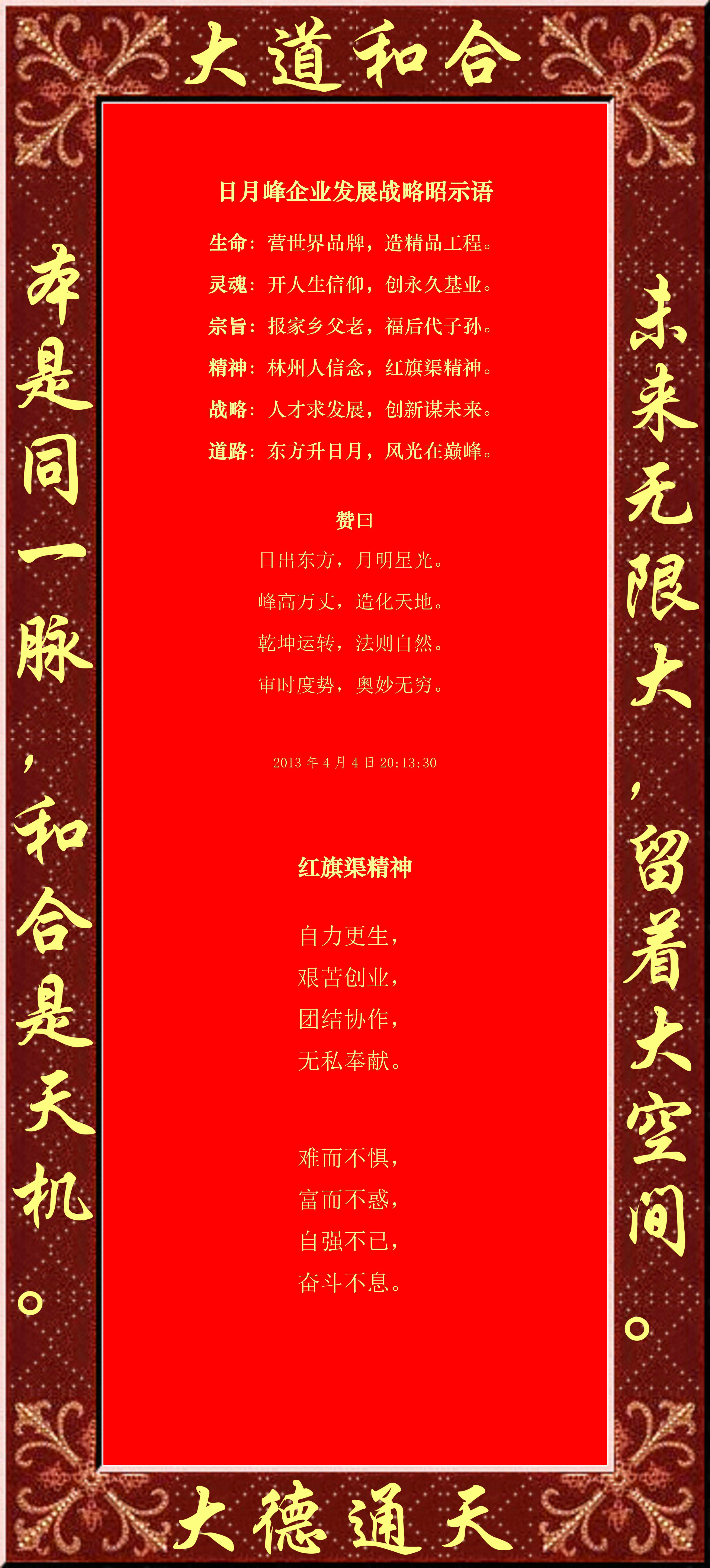 這是十二年前給日月峰制定的公司發展戰略昭示語,發表在山西日月峰建筑工程有限公司網站企業文化欄目上。