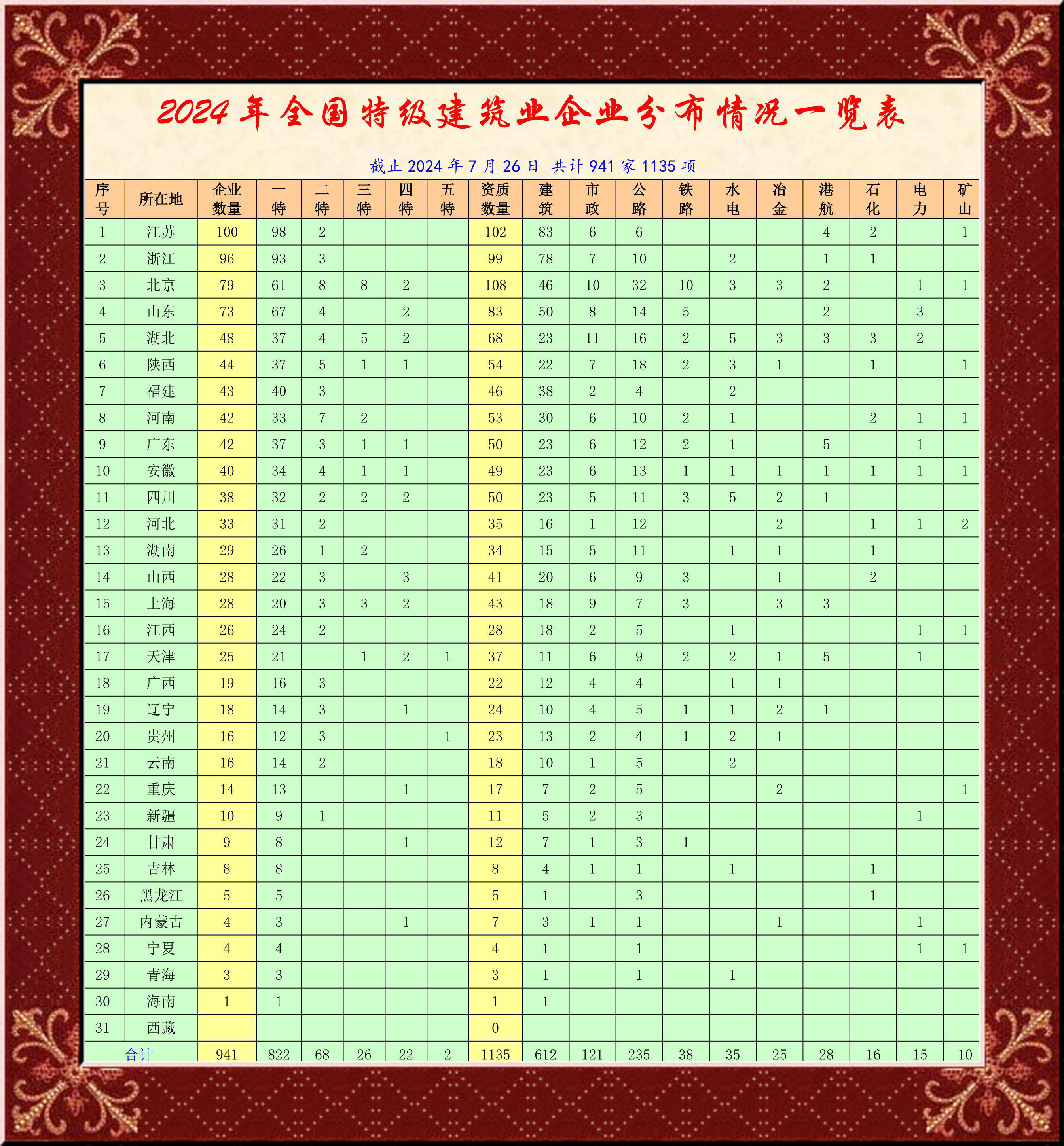 今天,住建部公告了今年第七批核準建筑業企業資質名單,56家(jia)企業(ye)資(zi)質升級或增項。全國特級資質企業941家,資質1135項。江蘇特級企業排名第一,北京資質排名第一,浙江特級企業排名第二,山東第四。