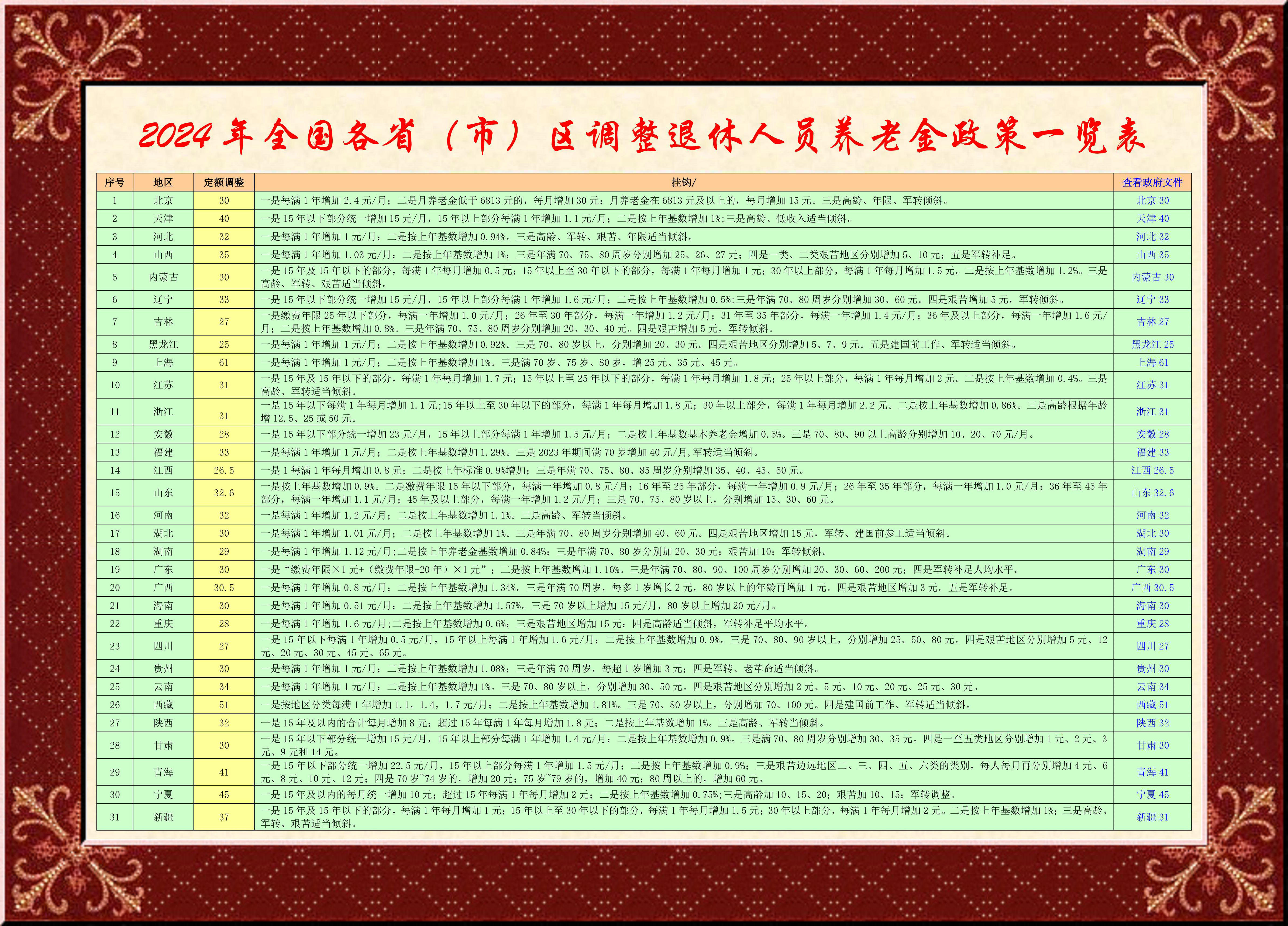 2024年全國31個省(市)自治區退休人員調整基本養老金已經落實到位,一(yi)(yi)年一(yi)(yi)度1.4億(yi)退休人(ren)員得到(dao)了實(shi)實(shi)在在的(de)實(shi)惠(hui),這是黨中央和各級人民政府把人民生活放在第一位的偉大功績,可圈可點,令人欣慰!