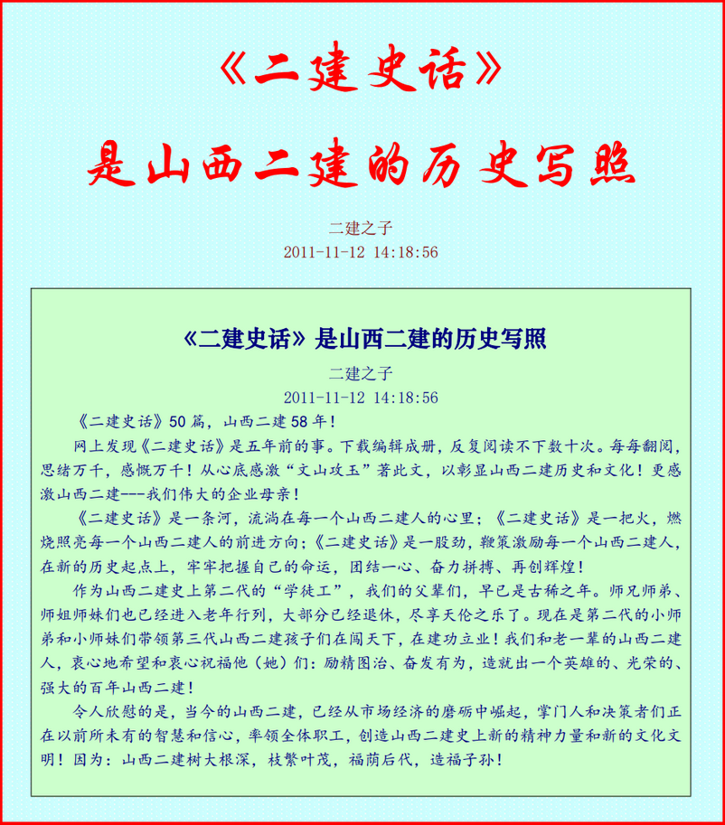 對山西三利裝飾集團有限公司印象深刻,是2011年我撰寫《二建史話》是山西二建的歷史寫照一文,被三利集團網站收入《美文欣賞》欄目之中。