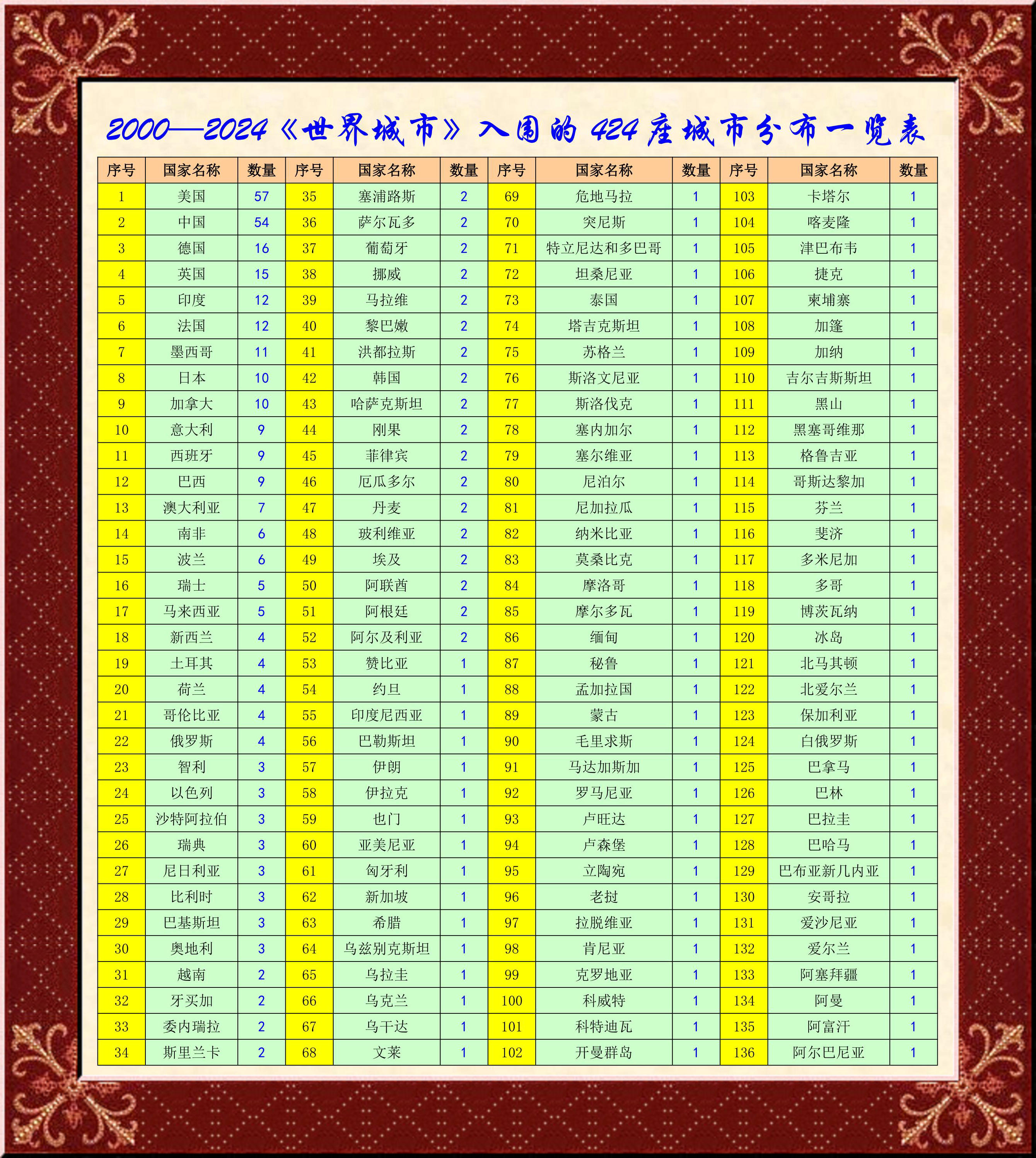 忙了三天的《世界城市名冊全名錄》,總感覺意猶未盡,不能給大家一個一目了然的效果,是什么呢?哦,各(ge)國上榜的(de)城(cheng)市數量呀!