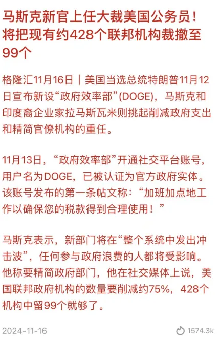 特朗普宣布將成立“政府效率部(DOGE)”,交給馬斯克和印度裔企業家拉瑪斯瓦米掌管,唯一目的就是給美國政府進行裁員。