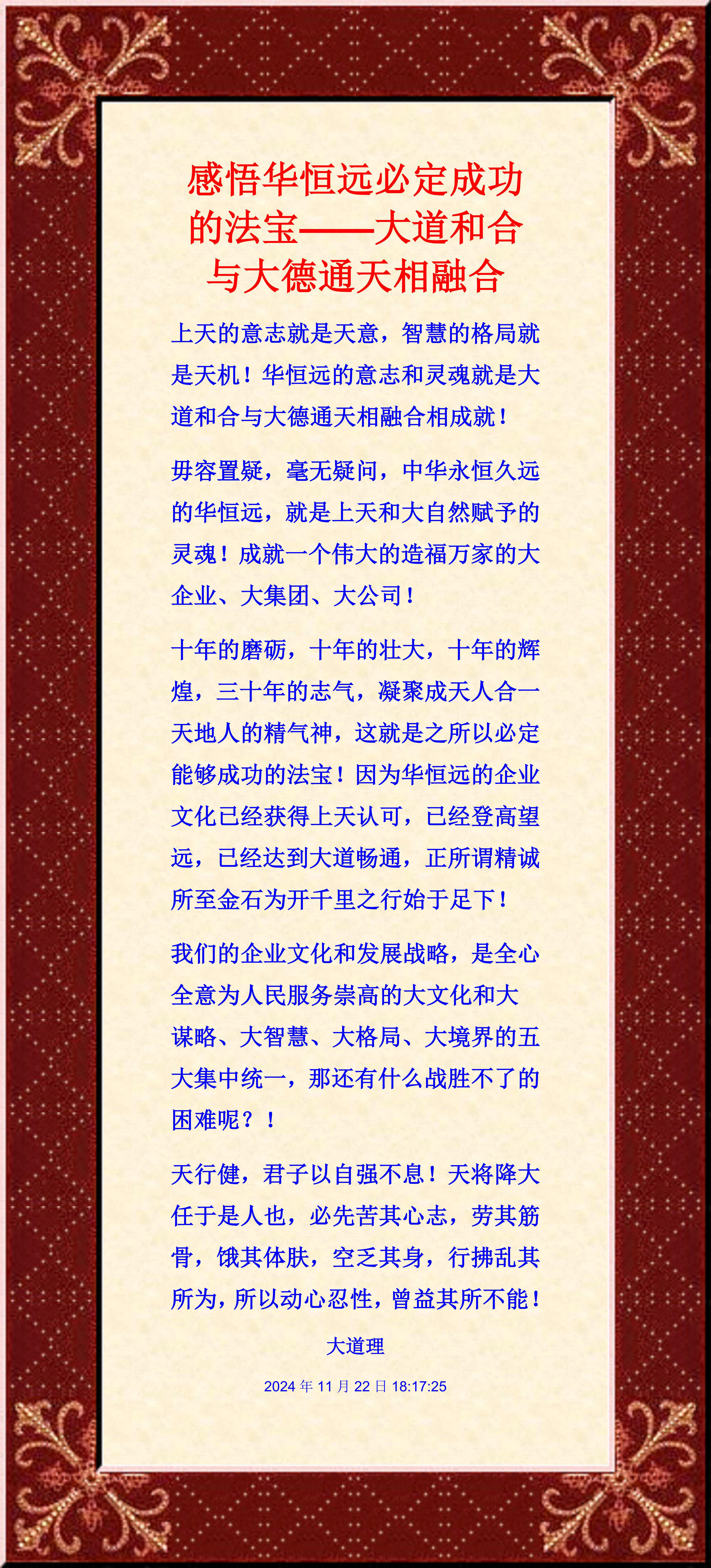 上天(tian)的(de)(de)意(yi)(yi)志就(jiu)是(shi)天(tian)意(yi)(yi),智慧的(de)(de)格(ge)局(ju)就(jiu)是(shi)天(tian)機!華恒遠(yuan)的(de)(de)意(yi)(yi)志和靈魂就(jiu)是(shi)大道(dao)和合與大德(de)通天(tian)相融合相成就(jiu)!