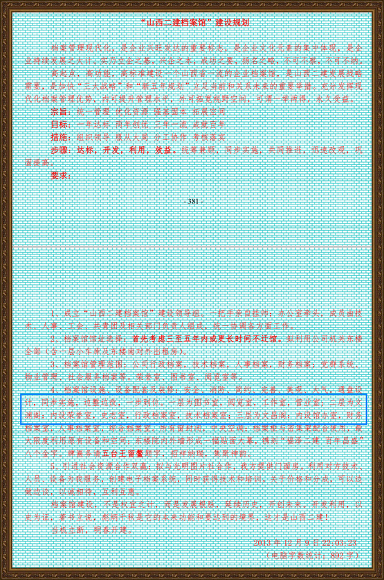 4、檔案館設施、設備配套及裝修:安全、消防、簡約、完善、美觀、大氣。通盤設計,同步實施,邊整邊改,一步到位。一層為圖書室,閱覽室,工作室,營業室;二層為文淵閣:內設榮譽室,史志室,行政檔案室,技術檔案室;三層為文昌閣:內設館辦室,財務檔案室,人事檔案室,綜合檔案室。所有窗封閉,中央空調;檔案柜與密集架配合使用,最大限度利用原有設備和空間;東樓院內外墻形成一幅貼面大幕,鐫刻“福澤二建 百年昌盛”八個金字。牌匾務請五臺王留鰲題字,招祥納瑞,集聚神韻。