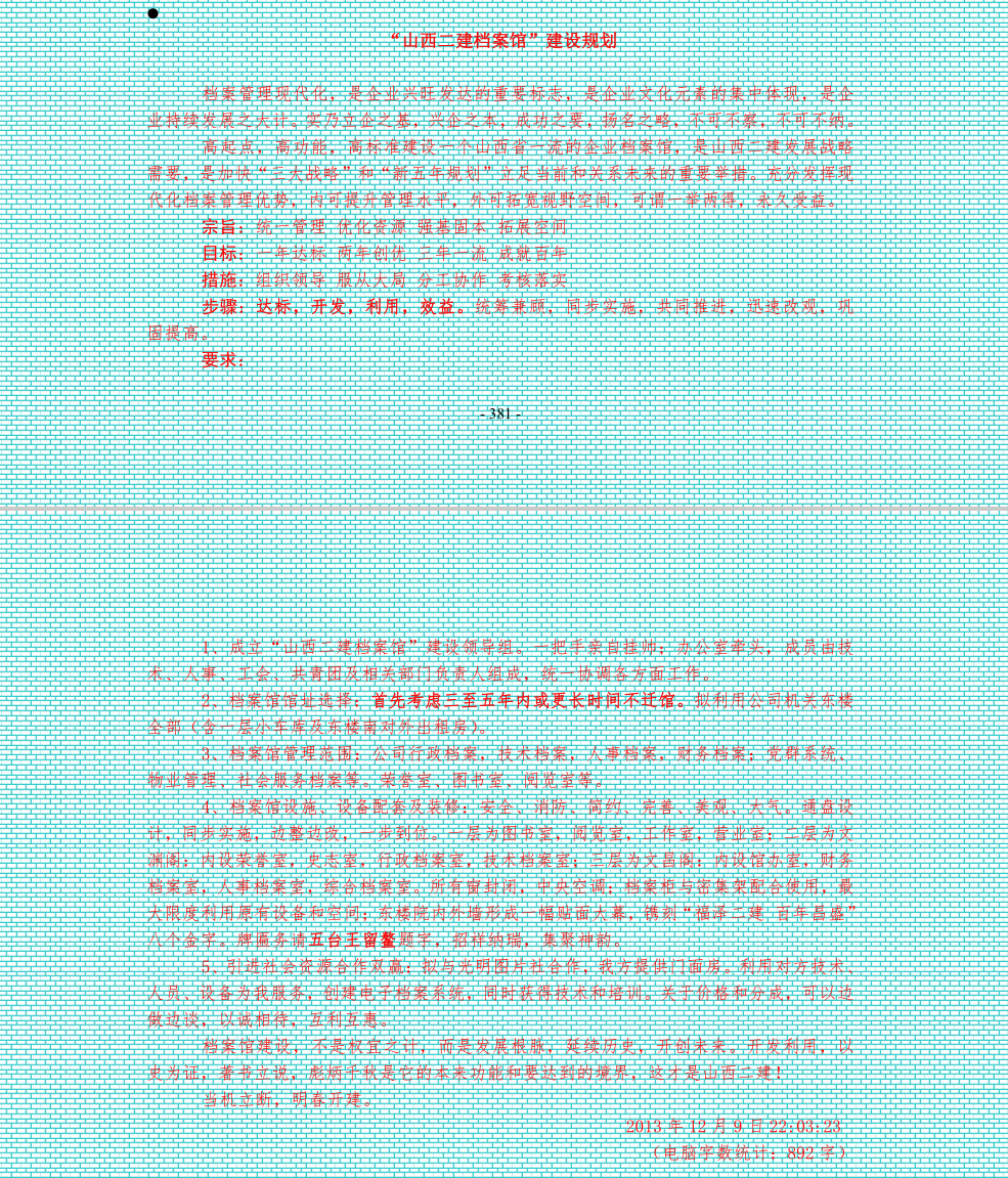1、成立“山西二建檔案館”建設領導組。一把手親自掛帥;辦公室牽頭,成員由技術、人事、工會、共青團及相關部門負責人組成,統一協調各方面工作。
