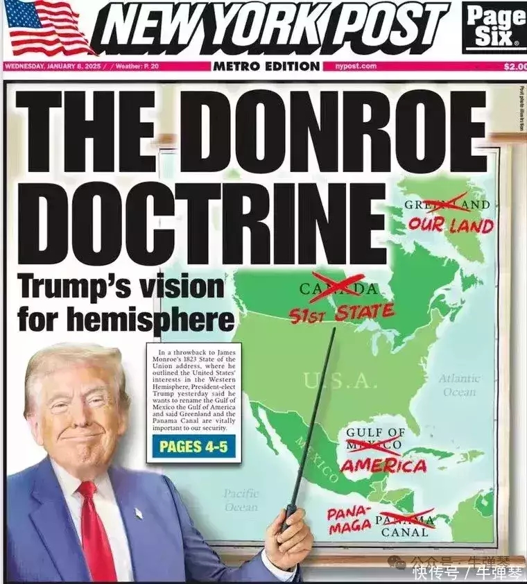 大標題就是“門羅主義”,下面一行小字,寫著“特朗普對西半球的愿景”。