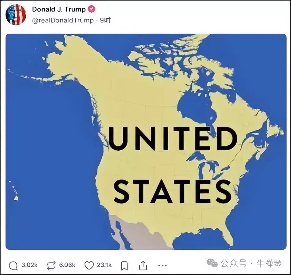 而且,特朗普越來越不掩飾,他最近更連發兩圖,在北美洲地圖上,只有美國,已經沒有加拿大。