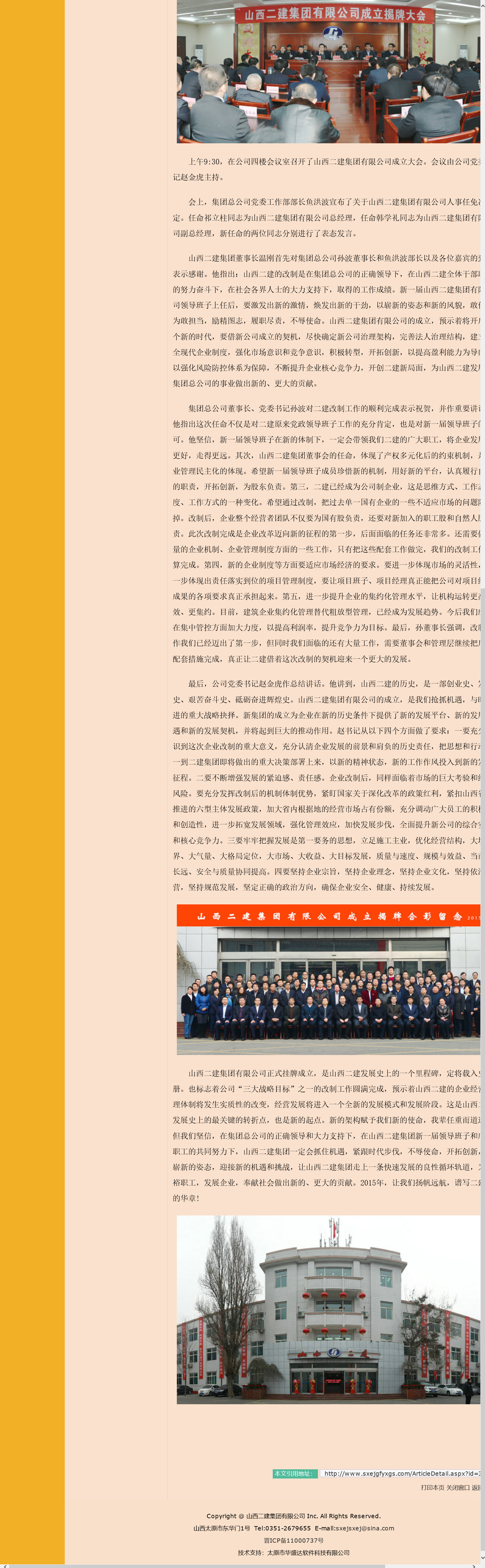 當時,他立刻打電話通知對方原路返回,表示承擔一切損失。隨后完全按照我的意見實施,就連字體都是征求我的意見制作的。2015年1月5日,山西二建集團有限公司揭牌儀式順利進行,使用近三十五年的山西省第二建筑工程公司名稱正式退出歷史舞臺,宣告改制后的山西二建正式成立!