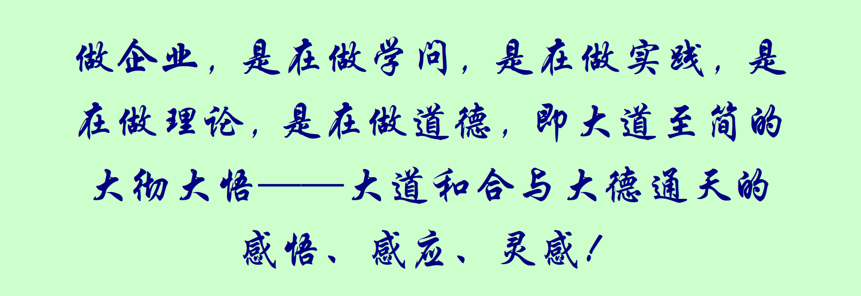 做(zuo)(zuo)企業,是在做(zuo)(zuo)學問(wen),是在做(zuo)(zuo)實踐,是在做(zuo)(zuo)理論,是在做(zuo)(zuo)道(dao)(dao)德,即大(da)(da)道(dao)(dao)至簡的大(da)(da)徹(che)大(da)(da)悟——大(da)(da)道(dao)(dao)和合與大(da)(da)德通天的感(gan)悟、感(gan)應、靈感(gan)!