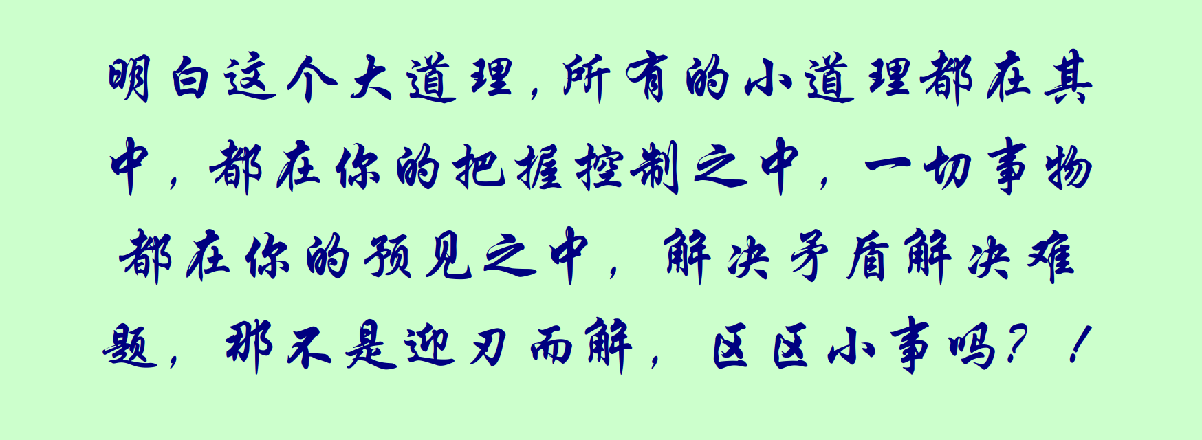 明白這個大(da)道理(li),所有(you)的(de)小(xiao)道理(li)都(dou)在(zai)其中(zhong),都(dou)在(zai)你(ni)的(de)把握控制之中(zhong),一切事(shi)物都(dou)在(zai)你(ni)的(de)預見(jian)之中(zhong),解(jie)決(jue)矛盾解(jie)決(jue)難題,那不(bu)是迎刃而解(jie),區區小(xiao)事(shi)嗎?!