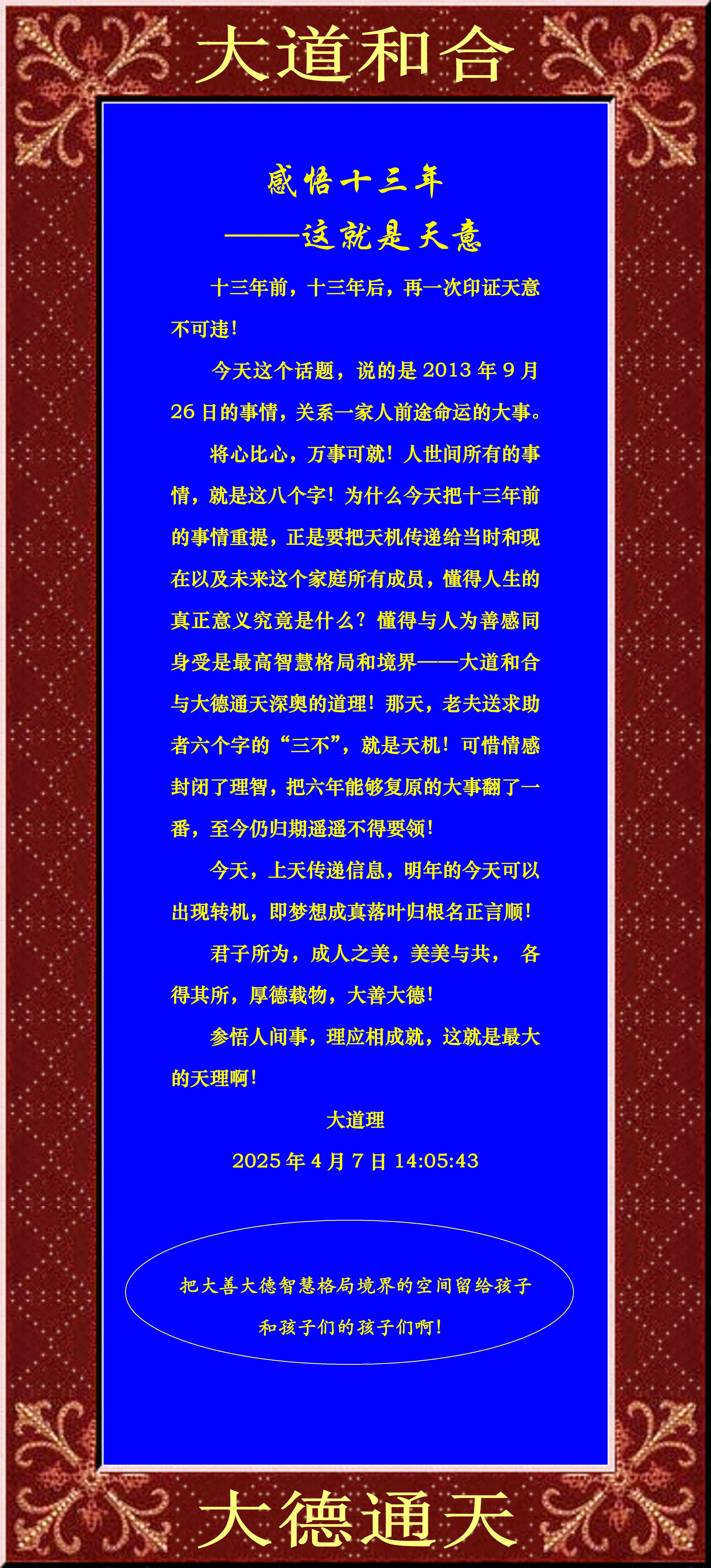 將心比心,萬事可就!人世間所有的事情,就是這八個字!為什么今天把十三年前的事情重提,正是要把天機傳遞給當時和現在以及未來這個家庭所有成員,懂得人生的真正意義究竟是什么?懂得與人為善感同身受是最高智慧格局和境界——大道和合與大德通天深奧的道理!那天,老夫送求助者六個字的“三不”,就是天機!可惜情感封閉了理智,把六年能夠復原的大事翻了一番,至今仍歸期遙遙不得要領!
