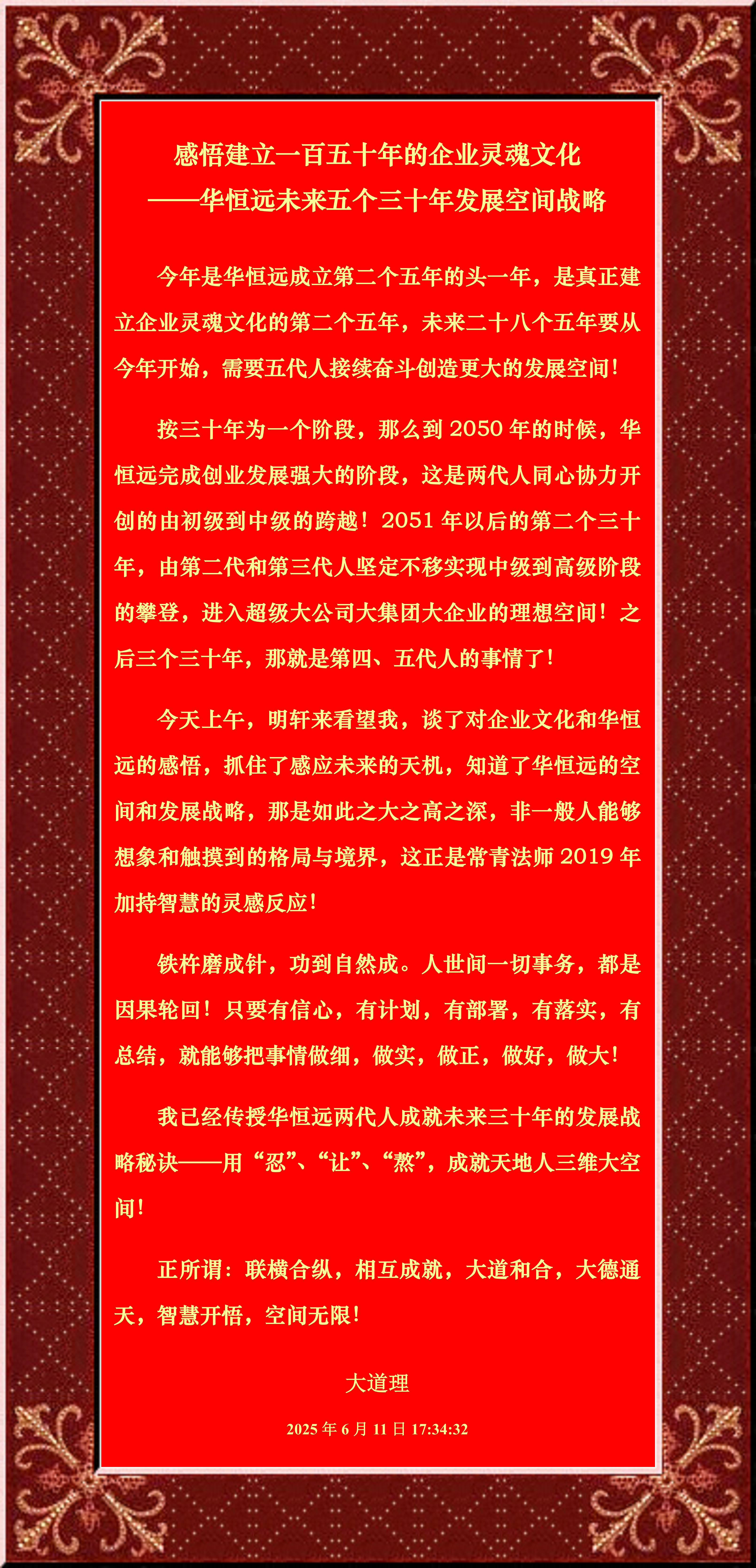 今天上午,明軒來看望我,談了對企業文化和華恒遠的感悟,抓住了感應未來的天機,知道了華恒遠的空間和發展戰略,那是如此之大之高之深,非一般人能夠想象和觸摸到的格局與境界,這正是常青法師2020年加(jia)持智慧的靈感反應!