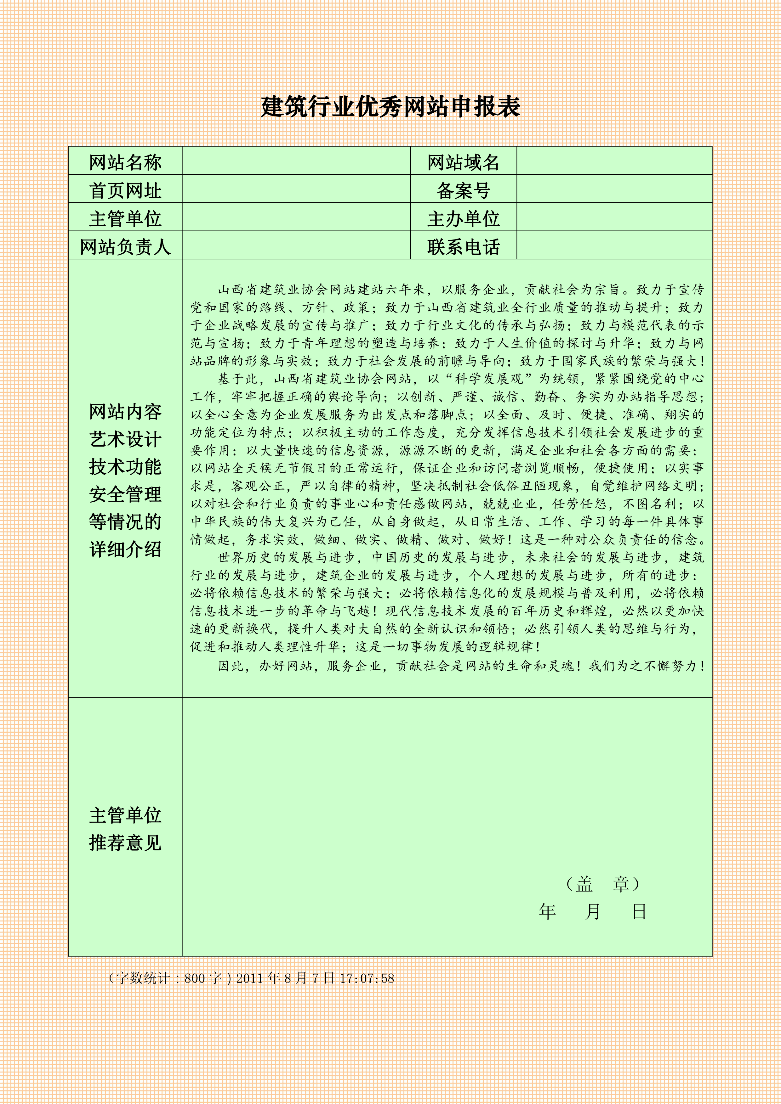 這是2011年在協會負責網站工作時,我親自撰寫的申報“全國建筑行業精品和優秀網站”的文稿,要求內容用五號楷體限制在800字。