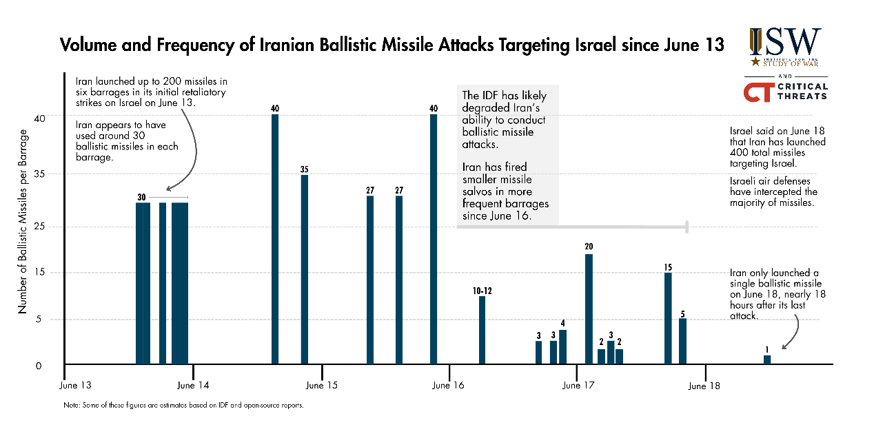 自6月13日以來,伊朗針對以色列的彈道導彈攻擊數量和頻率戰爭研究所