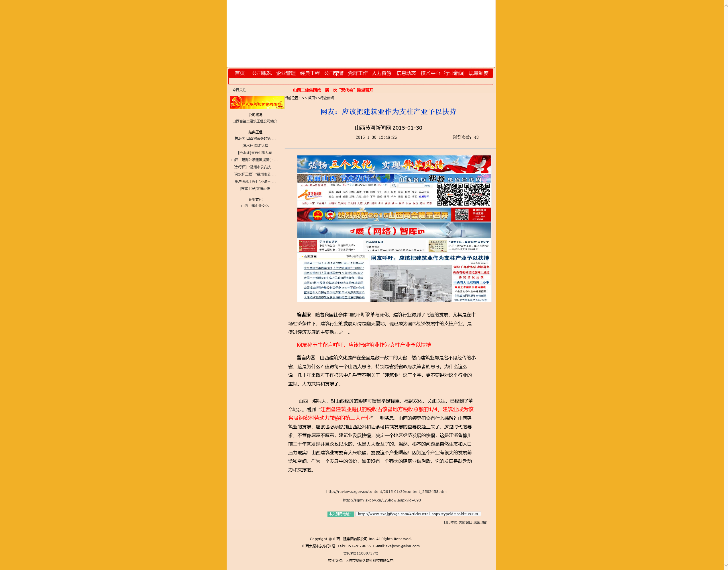 留言內容:山西建筑文化遺產在全國是數一數二的大省,然而建筑業卻是名不見經傳的小省,這是為什么?值得每一個山西人思考,特別是省委省政府決策者的思考。為什么這么說,幾十年來政府工作報告中幾乎查不到關于“建筑業”這三個字,更不要說對這個行業的重視、支持、大力扶持和發展了。山西一煤獨大,對山西經濟的影響可謂是舉足輕重,福禍雙依,長此以往,已經到了革命地步。看到“江西省建筑業提供的稅收占該省地方稅收總額的1/4,建筑業成為該省吸納農村勞動力轉移的第二大產業”一則消息,山西的領導們會有什么感觸?山西建筑業的發展,應該也必須提到山西經濟和社會可持續發展的重要議題上來了,這是時代的要求,不管你愿意不愿意,建筑業發展快慢,決定一個地區經濟發展的快慢,這是江浙魯豫川前三十年就發現并且孜孜以求的,也是大大受益了的。當然,根本的問題是自然生態和人口壓力逼迫的!山西建筑業需要有人來喚醒,需要這個產業崛起!因為這個產業有很大的發展前途和空間,作為一個發展中的省份,如果沒有一個強大的建筑業做后盾,她的發展是缺乏動力和支撐的。
