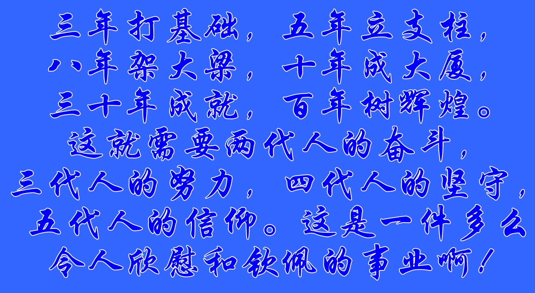 三年(nian)打基礎(chu),五年(nian)立支(zhi)柱,八(ba)年(nian)架大梁(liang),十年(nian)成大廈,三十年(nian)成就,百(bai)年(nian)樹輝(hui)煌。這就需要兩代(dai)人(ren)的(de)奮斗,三代(dai)人(ren)的(de)努力,四代(dai)人(ren)的(de)堅守,五代(dai)人(ren)的(de)信仰。這是(shi)一(yi)件多么(me)令人(ren)欣(xin)慰和欽佩的(de)事業(ye)啊!