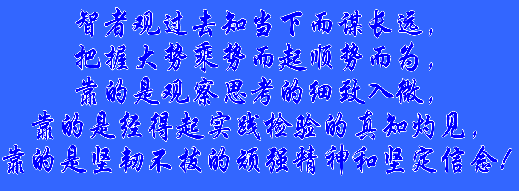 智者觀過去知當下而謀長(chang)遠,把(ba)握大勢乘勢而起順勢而為,靠的(de)(de)是觀察思考的(de)(de)細致入微,靠的(de)(de)是經得起實踐(jian)檢驗(yan)的(de)(de)真知灼見(jian),靠的(de)(de)是堅韌不(bu)拔(ba)的(de)(de)頑強精神和堅定信念!