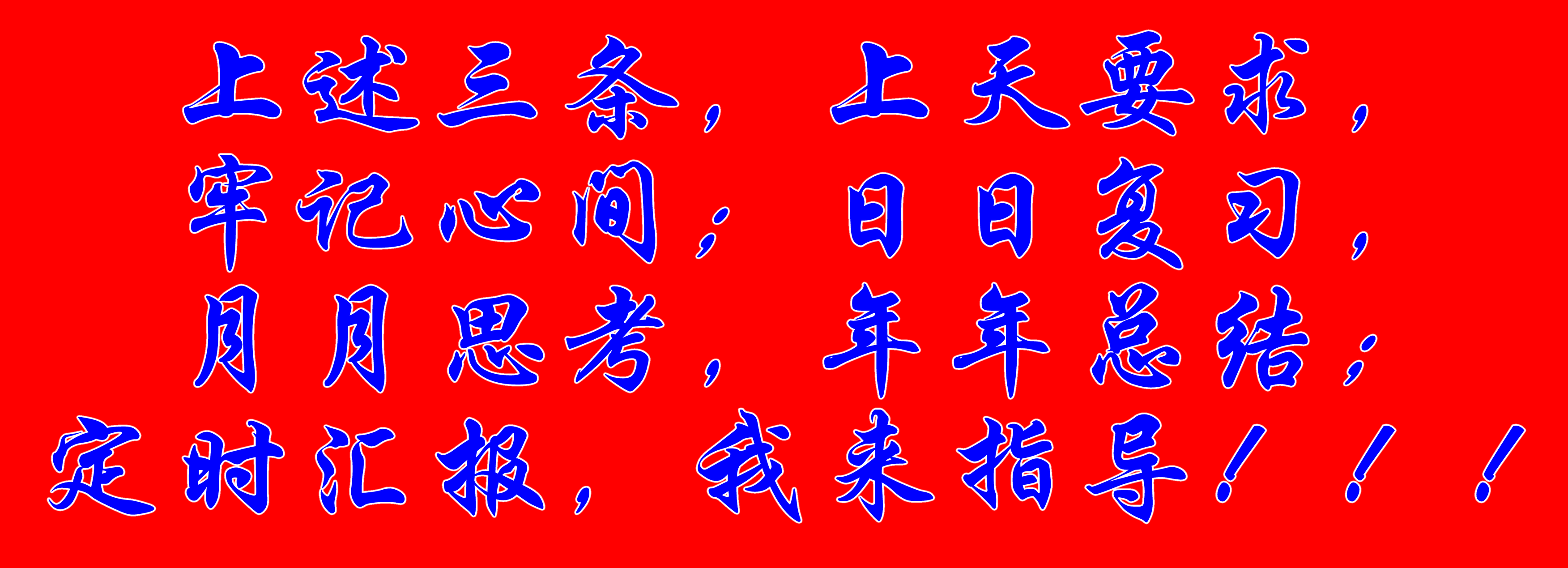 上述三條(tiao),上天要(yao)求,牢記心間;日日復習,月月思考,年(nian)(nian)年(nian)(nian)總結;定時匯報,我來指導!!!