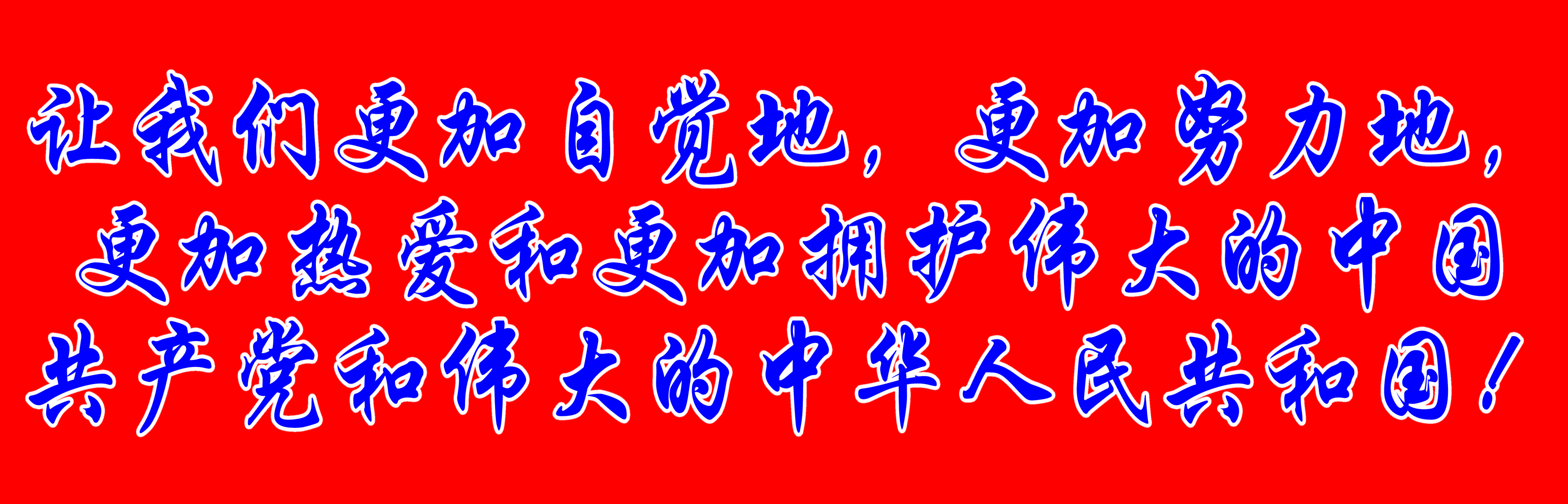 我(wo)們有幸(xing)生活在這(zhe)樣偉大的(de)時代(dai),偉大的(de)國(guo)家,偉大的(de)社(she)會(hui),充滿(man)美好的(de)幸(xing)福感,滿(man)足感,榮譽感。讓我(wo)們更(geng)加自(zi)覺地(di),更(geng)加努力地(di),更(geng)加熱愛和更(geng)加擁護(hu)偉大的(de)中國(guo)共產(chan)黨和偉大的(de)中華人民共和國(guo)!