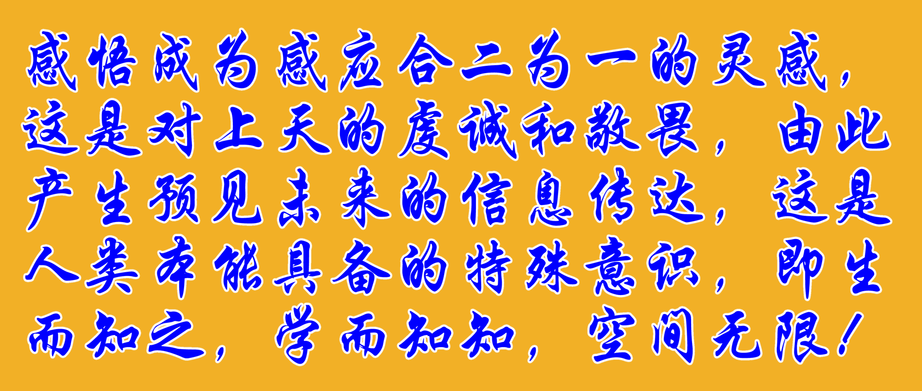 感悟成為感應合二為一的靈感,這是對上天的虔誠和敬畏,由此產生預見未來的信息傳達,這是人類本能具備的特殊意識,即生而知之,學而知知,空間無限!