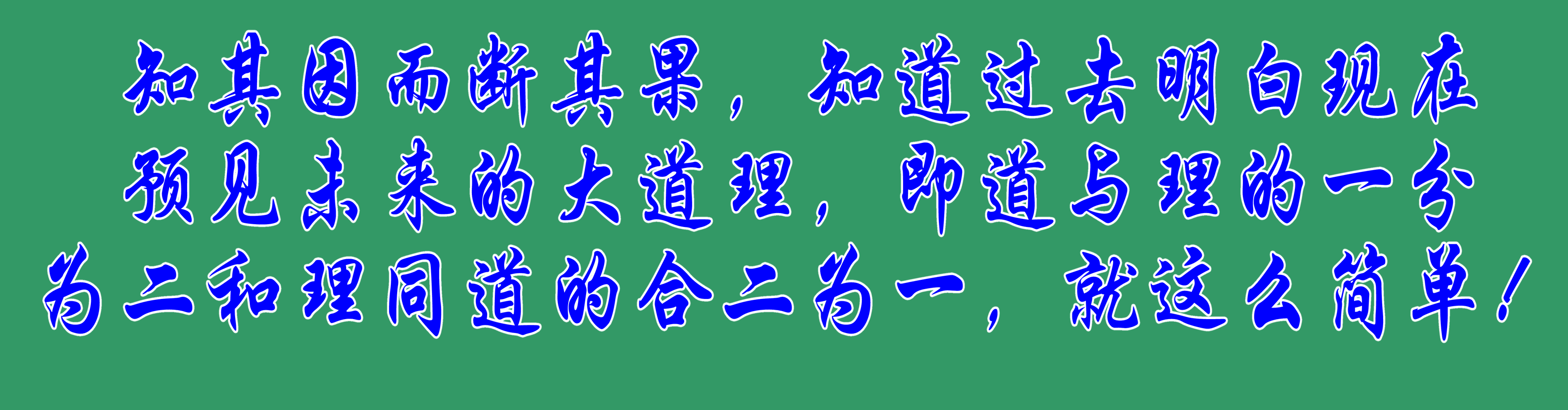 經過(guo)一(yi)個(ge)輪(lun)回(hui)的(de)經歷(li),經過(guo)反復思(si)考實踐,這個(ge)問題有了(le)解開的(de)答案(an)和(he)方法,就是知(zhi)其因而斷其果,知(zhi)道過(guo)去明白現在(zai)預(yu)見未來的(de)大道理,即道與理的(de)一(yi)分為二和(he)理同道的(de)合二為一(yi),就這么簡單!