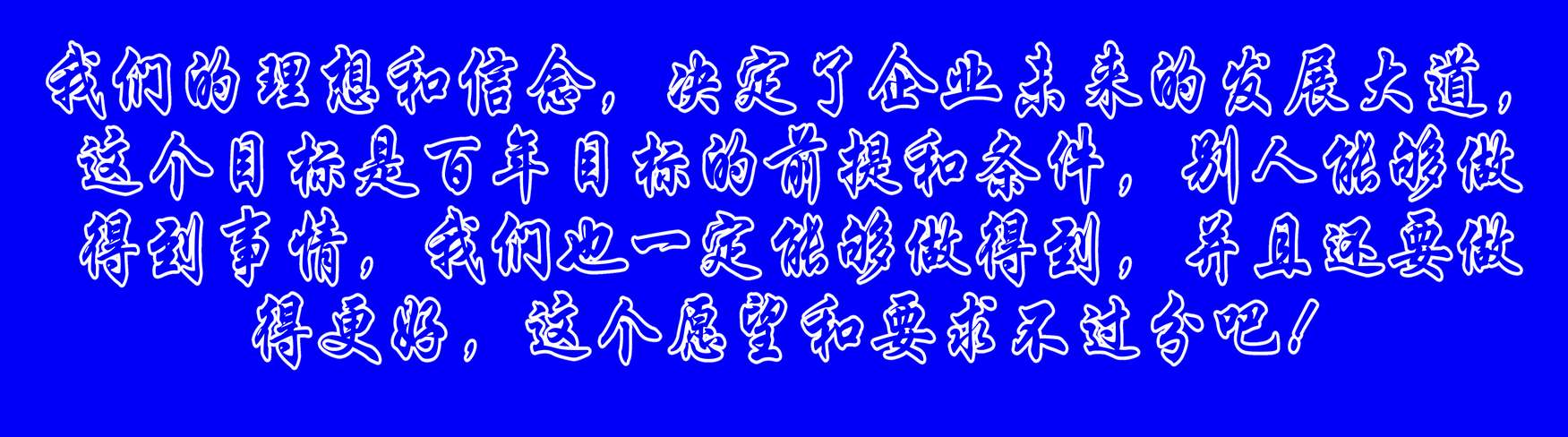 我們的理想和信念,決定了企(qi)業(ye)未(wei)來(lai)的(de)發展大(da)道,這個(ge)目標是百年目標的前(qian)提和(he)條件(jian),別人能夠做得到事情,我們也一定能夠做得到,并且還要做得更好,這個(ge)愿(yuan)望和(he)要求不過分吧(ba)!