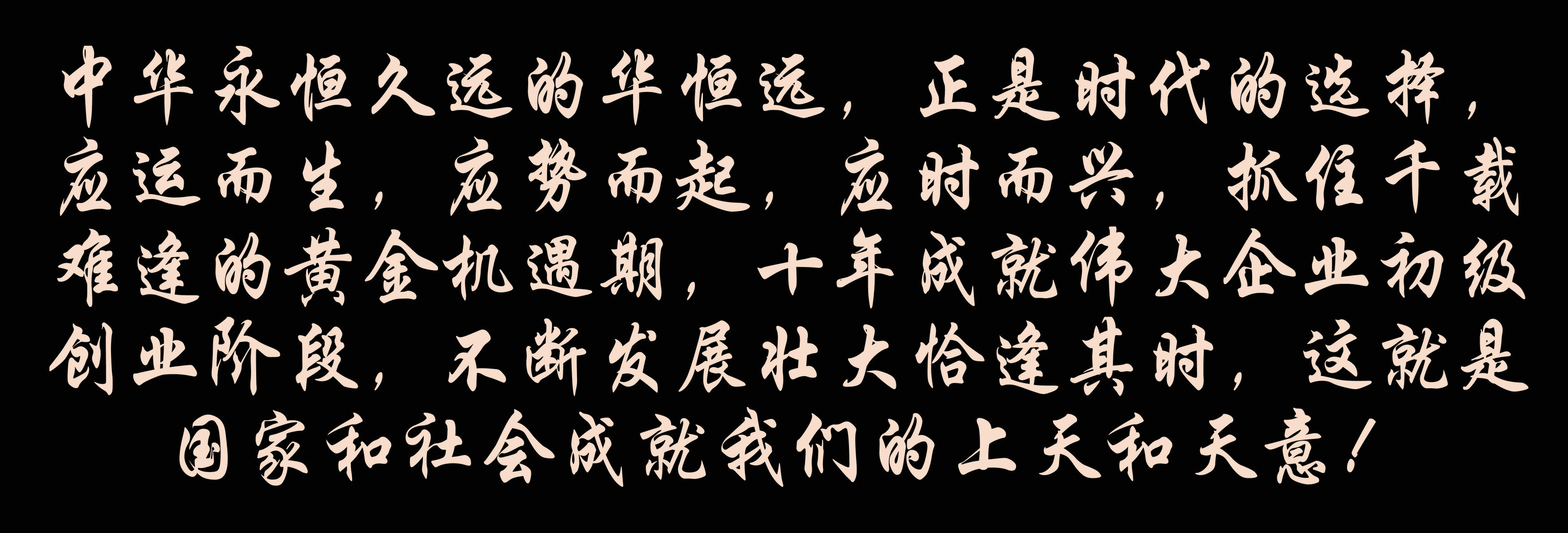 中華永恒久遠的(de)華恒遠,正是(shi)時代的(de)選擇,應運而生,應勢而起,應時(shi)而興,抓(zhua)住千載難(nan)逢的黃(huang)金機遇期,十年成就(jiu)(jiu)偉大企業初(chu)級創(chuang)業階段,不斷發展壯大恰逢其時(shi),這就(jiu)(jiu)是國家(jia)和社會成就(jiu)(jiu)我們的上天(tian)和天(tian)意!