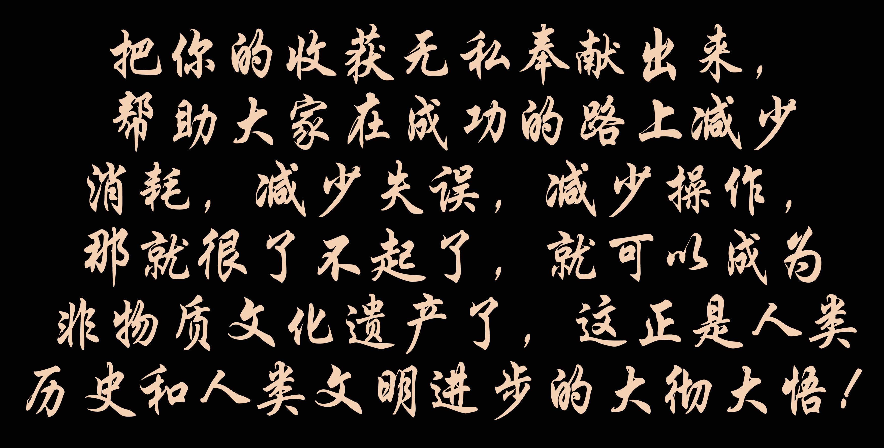 把你的收獲無私奉獻出來,幫助大家在成功的路上減少消耗,減少失誤,減少操作,那就很了不起了,就可以成為非物質文化遺產了,這正是人類歷史和人類文明進步的大徹大悟!