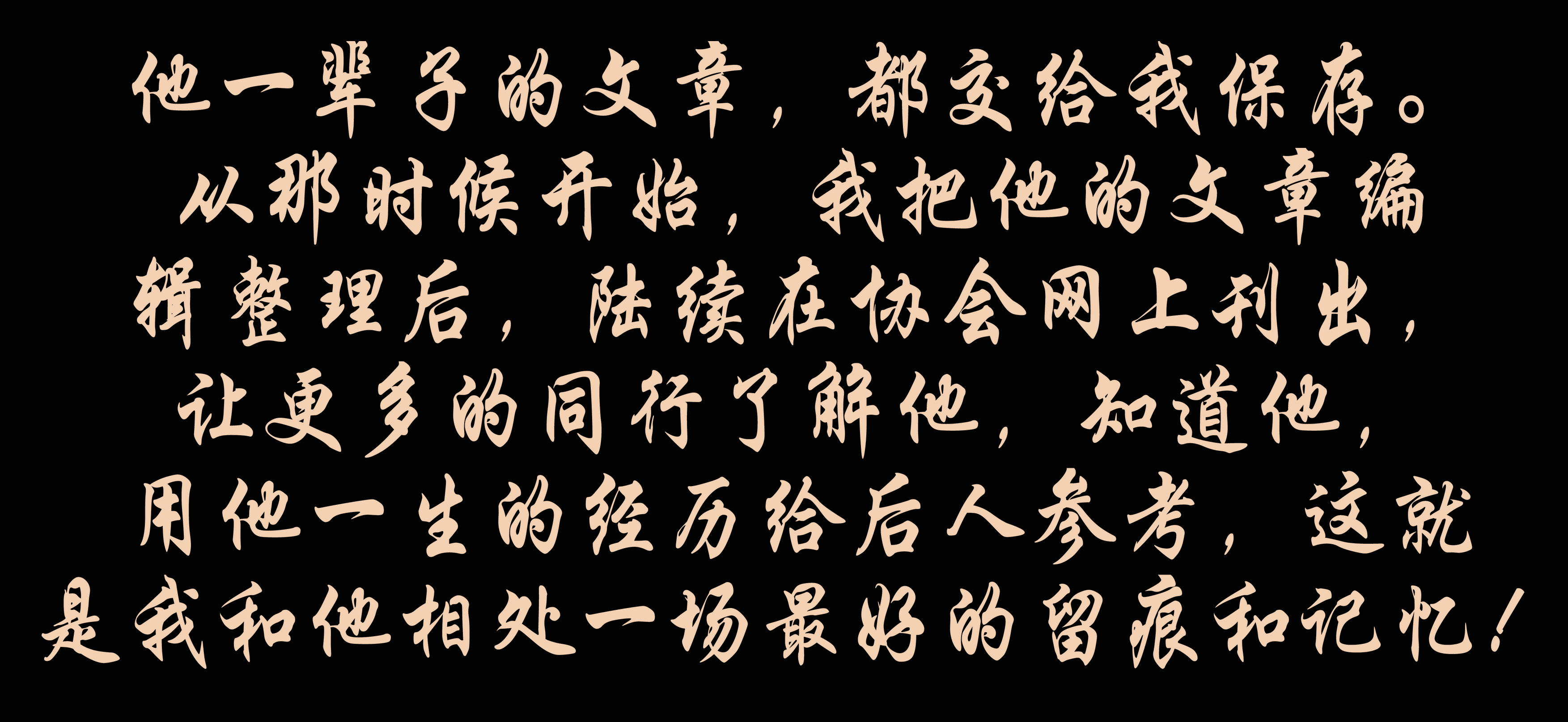 他一輩子的文章,都交給我保存。從那時候開始,我把他的文章編(bian)輯(ji)整理后,陸續(xu)在(zai)協(xie)會網上(shang)刊出,讓更多的同行了解他,知道他,用他一生的經歷給后人參考,這就是我和他相處一場最好的留痕和記憶!