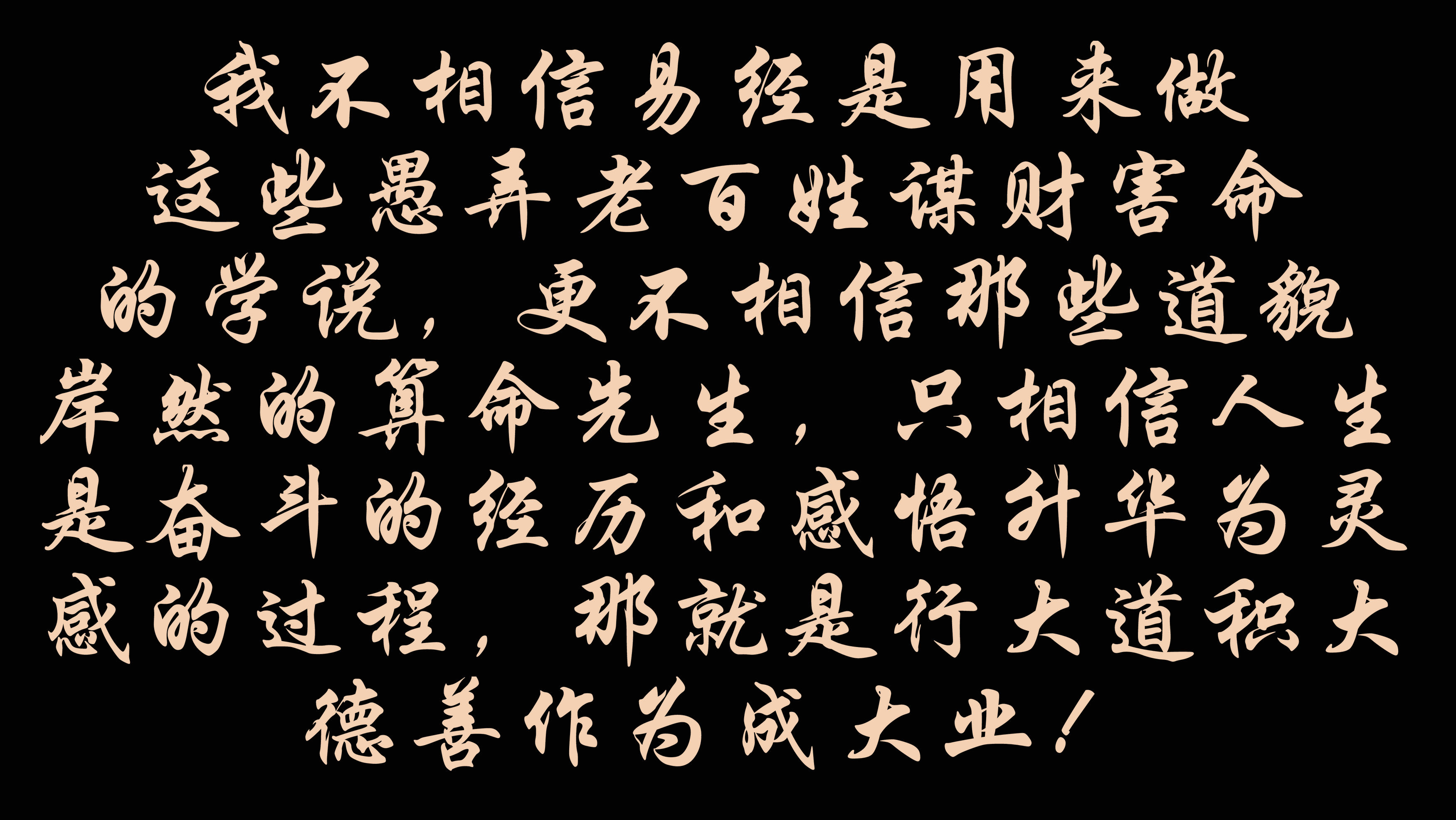 我(wo)不相信(xin)易經是用來(lai)做(zuo)這些(xie)愚弄老百姓謀財害命的(de)(de)學(xue)說,更不相信(xin)那(nei)些(xie)道貌岸(an)然的(de)(de)算命先生,只(zhi)相信(xin)人生是奮斗的(de)(de)經歷和感悟升(sheng)華為靈感的(de)(de)過程,那(nei)就是行大道積(ji)大德(de)善作為成(cheng)大業!