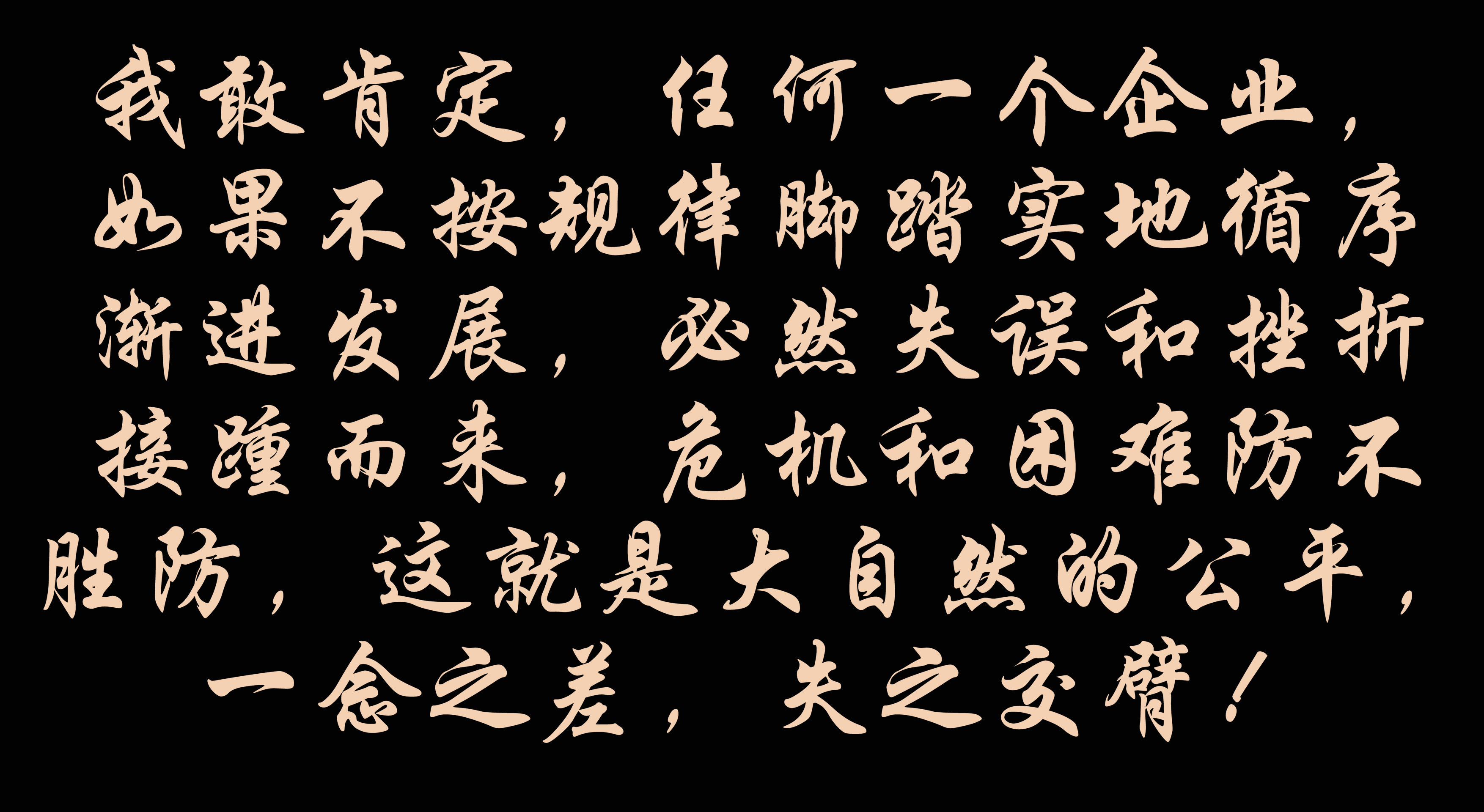 我敢肯定,任何一個企業,如果不按規律腳踏實地循序漸進發展,必然失誤和挫折接踵而來,危機和困難防不勝防,這就是大自然的公平,一念之差,失之交臂!耽誤了你的寶貴時間和機遇,可惜了!